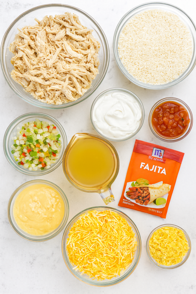 - In a large bowl, mix together the chicken, uncooked rice, cream of chicken soup, sour cream, diced onion and bell pepper, tomatoes with chilies, chicken broth, fajita seasoning, and about half of the cheese.