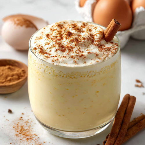 • Before serving, give the eggnog a gentle stir, then pour into glasses. Garnish with a sprinkle of freshly grated nutmeg or a dollop of whipped cream if desired.