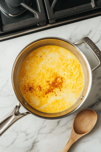 • In a medium saucepan over medium heat, combine the coconut milk, water, turmeric, cumin, and salt.