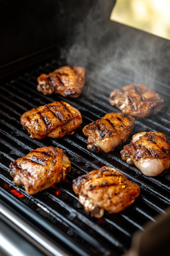 • Add the marinated chicken thighs to the grill and cook for 4-5 minutes on each side, until the internal temperature reaches 165°F.
