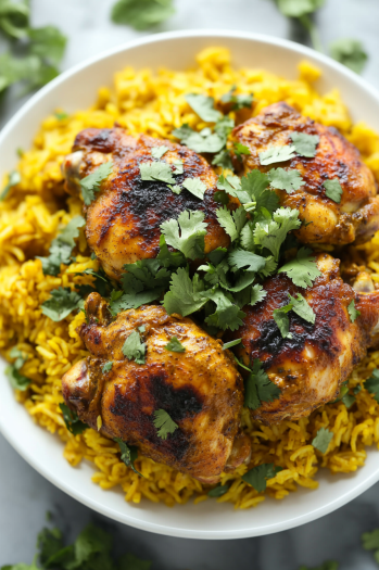 • Serve the grilled curry chicken over the coconut turmeric rice, garnished with chopped fresh cilantro.