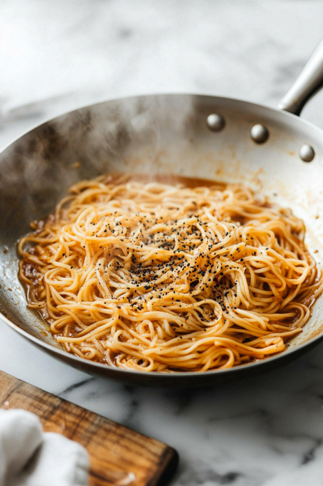 - Toss in your cooked noodles and black pepper. Stir it all up until the noodles soak up the yummy sauce.