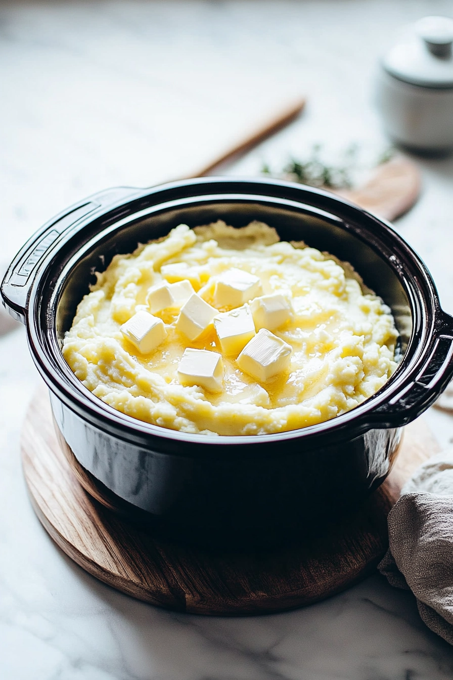 Peel and chop 5 pounds of russet potatoes into 1-inch pieces, then place them in the bottom of a 6-quart crock pot. Add 1/2 cup (1 stick) of salted butter, cut into cubes, and pour a 32-ounce carton of chicken broth over the potatoes.