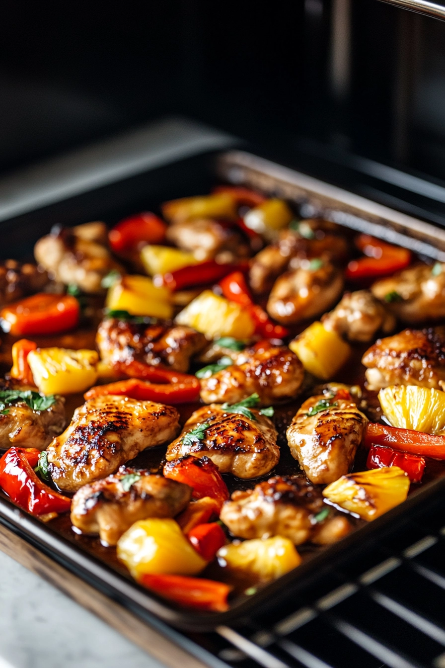 Sweet pineapple, tender chunks of chicken, and crisp bell peppers roast in a sticky-salty glaze that tastes like something you’d get at your favorite island-inspired grill.