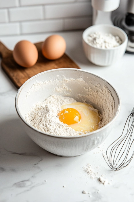 - Whip eggs and sugar until fluffy (2-3 minutes).