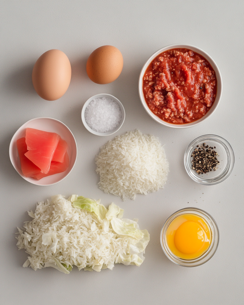 - In a mixing bowl, combine cooked rice, 1 lb lean ground beef, 1/4 cup chopped onion, slightly beaten egg, 1/2 of the condensed tomato soup, 1 tsp salt, and 1/4 tsp black pepper. Mix until evenly combined.