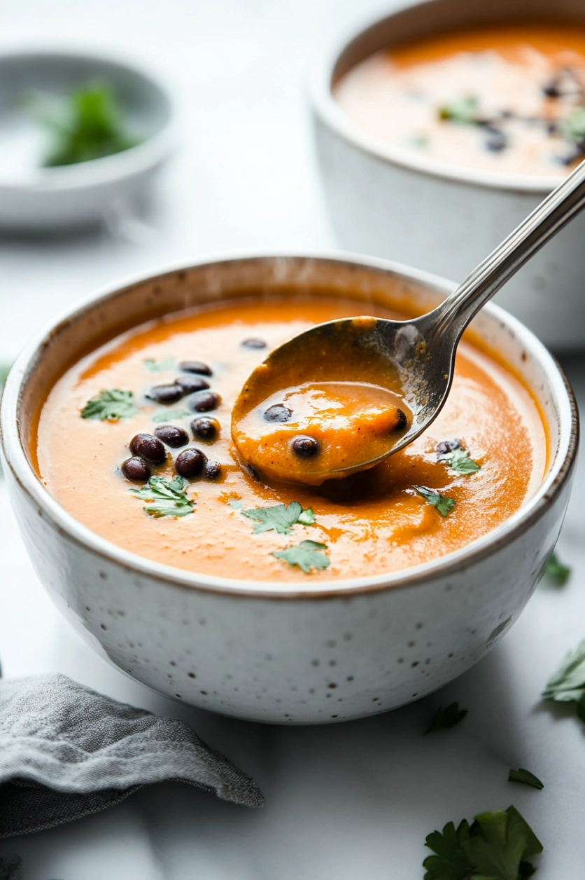 The sweet potatoes roast until beautifully caramelized and slightly smoky, while the black beans add heartiness and protein. Blended together, it creates a rich, creamy soup with just enough texture to keep every spoonful satisfying.
