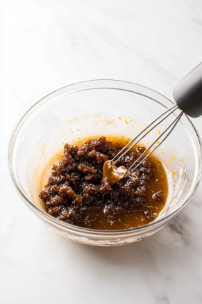 • Cream the Butter and Sugars: In a large bowl, whisk together the softened vegan butter, dark and light brown sugars, treacle, and citrus zests until light and fluffy.