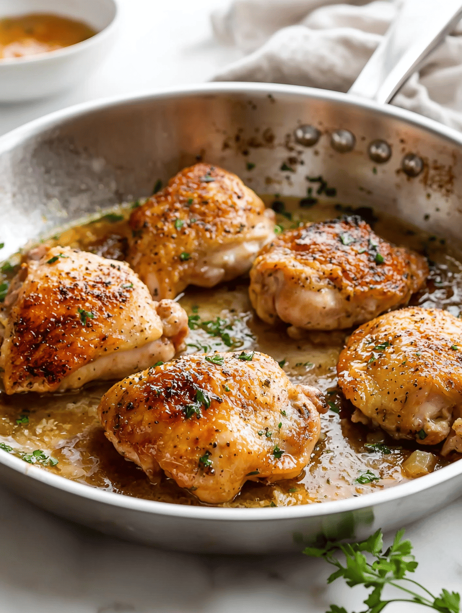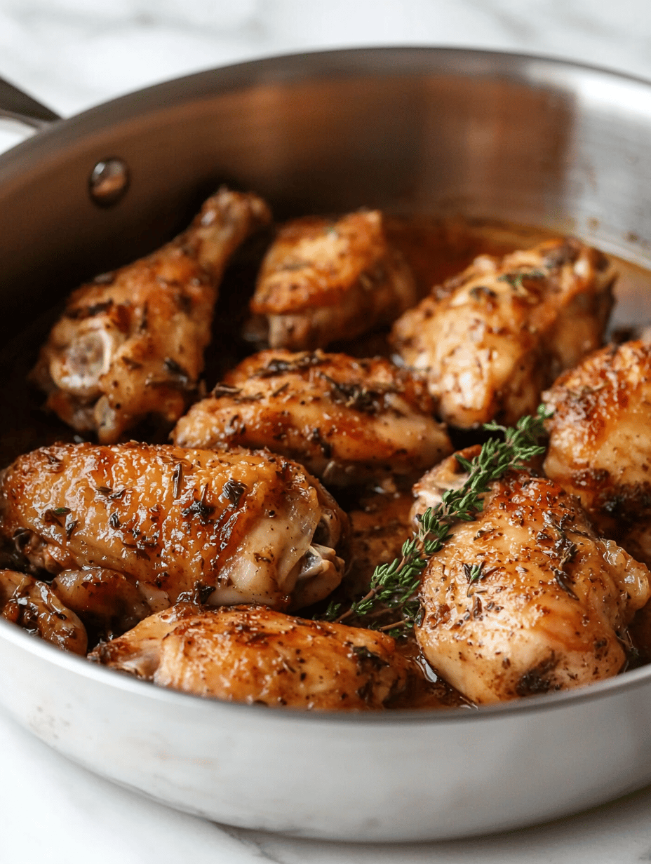 Stir in the dried thyme and return the browned chicken to the pot, nestling it into the sauce. Bring the mixture to a gentle simmer, cover, and cook on low heat for about 30 minutes until the chicken is tender and cooked through.