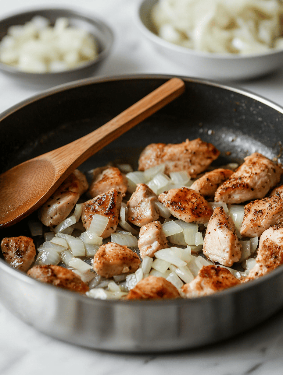 Remove the browned chicken and set aside on a plate. In the same pot, add the chopped onions and sauté for 3-4 minutes until they’re soft and translucent, and smell sweet.