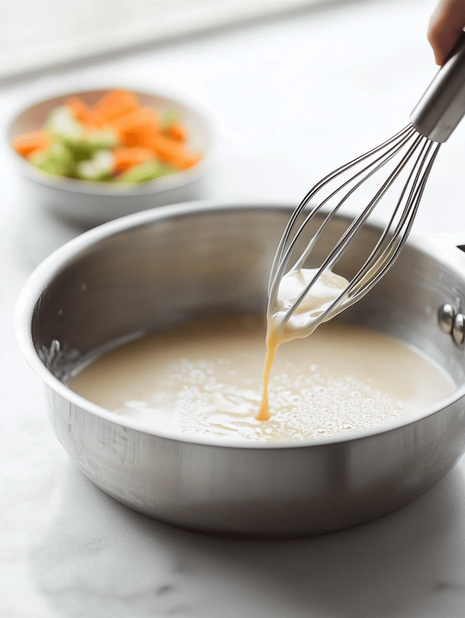 Gradually pour in the chicken broth while whisking constantly to prevent lumps, then add the milk or cream, stirring until the sauce begins to thicken and becomes smooth.