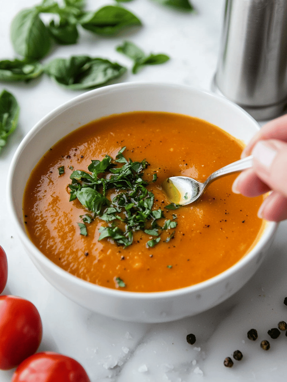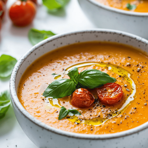 This soup is made by roasting cherry tomatoes with smoky paprika until blistered and fragrant, then blending them into a smooth, vibrant puree. Fresh basil, honey, and balsamic vinegar are added to enhance the natural sweetness and depth, resulting in a creamy, silky texture with a bright, savory flavor profile. It showcases seasonal produce in a comforting, visually appealing bowl.
