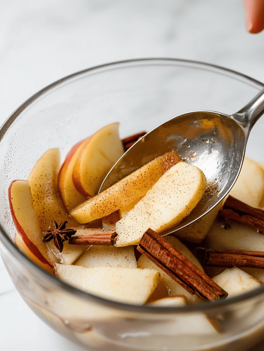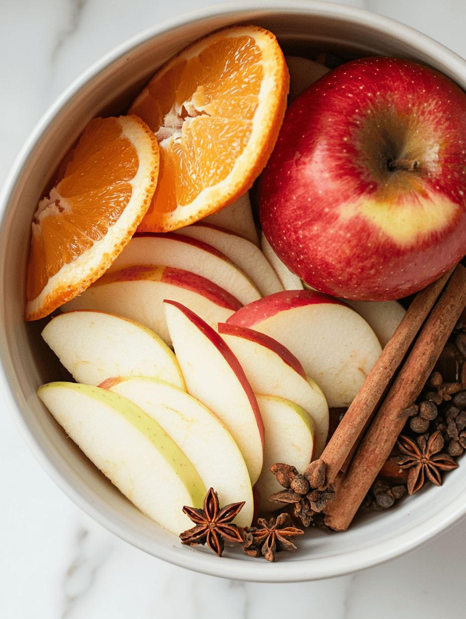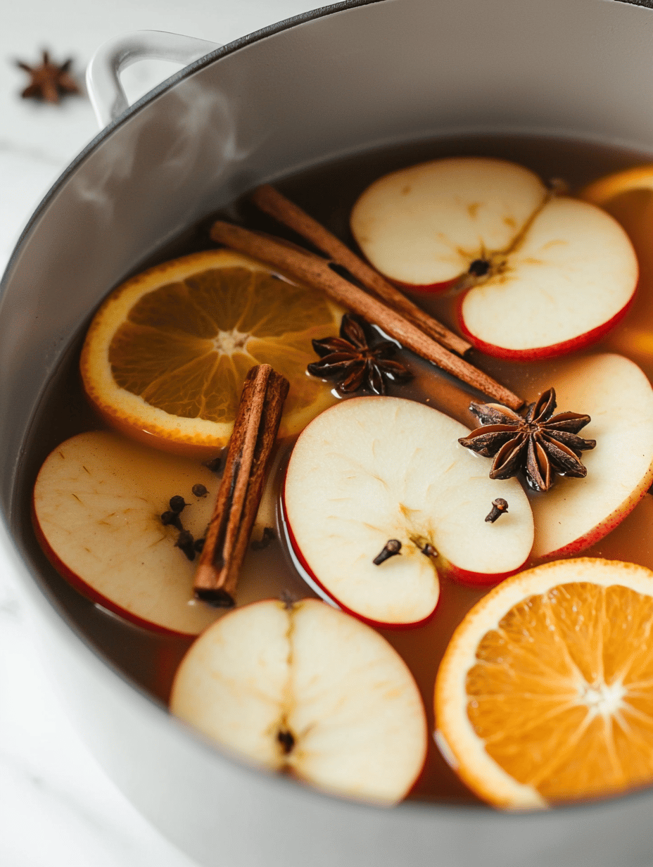 This simmering potpourri combines cinnamon sticks, cloves, and fresh apple slices to create a fragrant aromatic blend. The ingredients are gently simmered on the stove, releasing a warm, spicy scent that evokes fall's cozy atmosphere and creates an inviting ambiance.