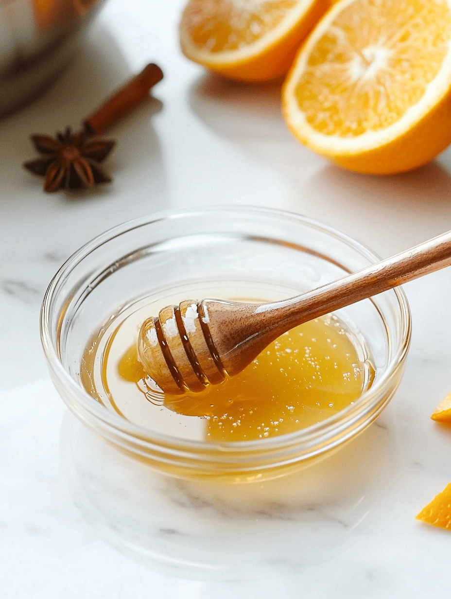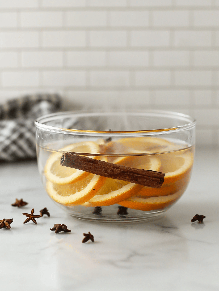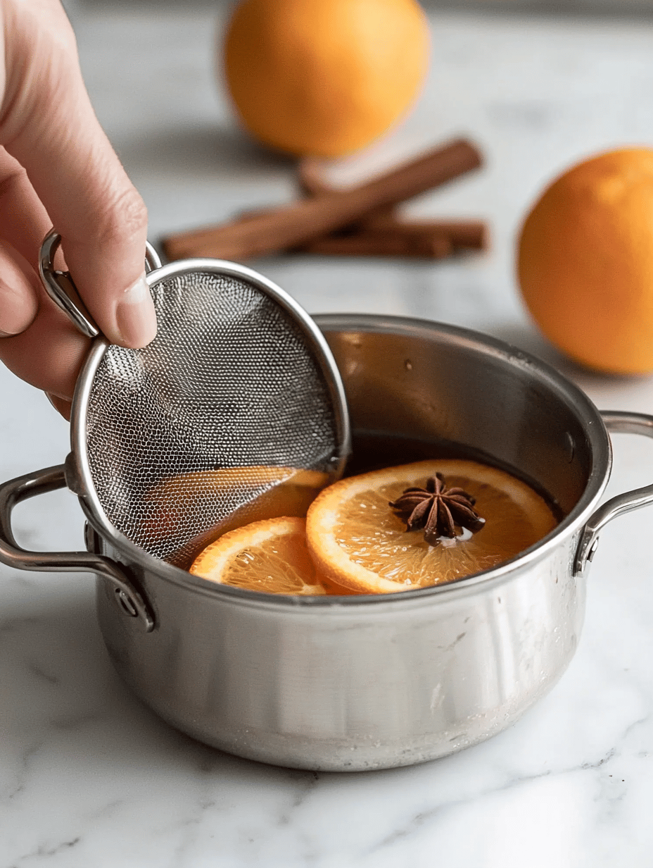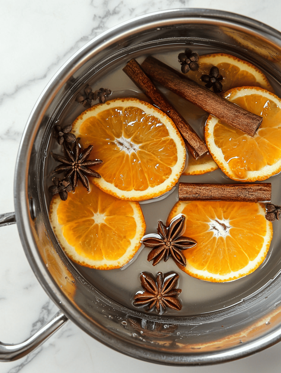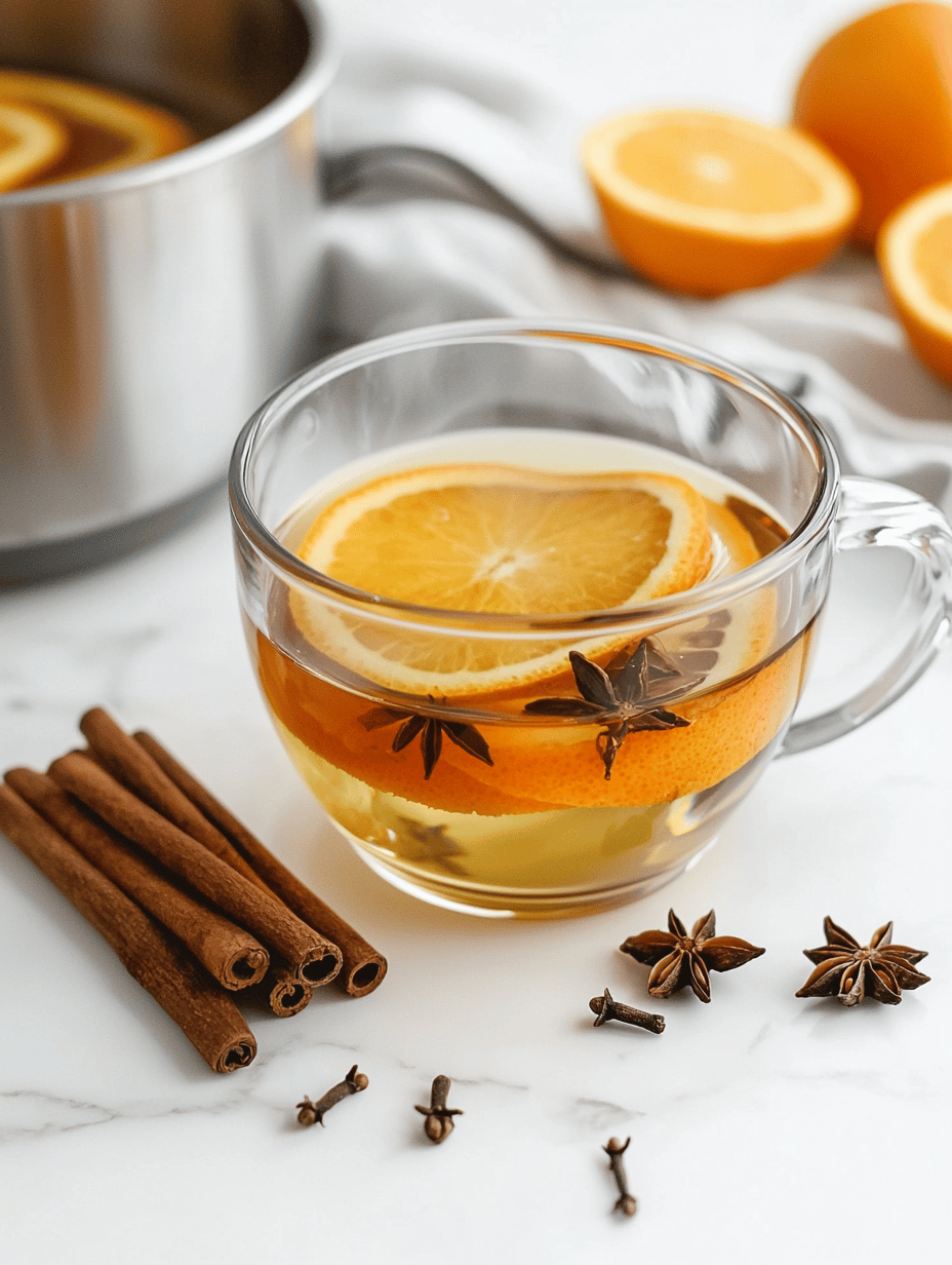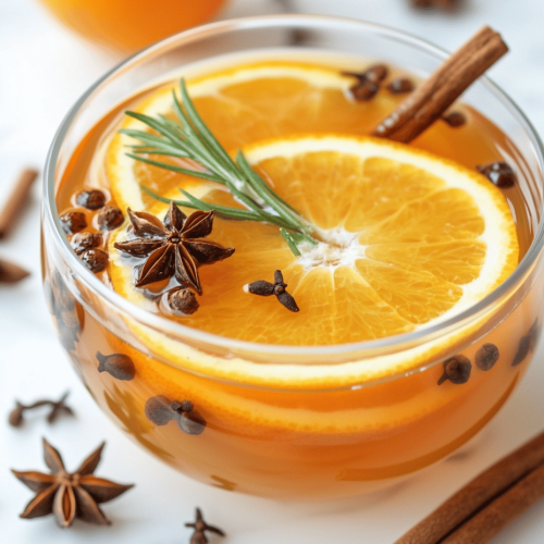 This simmered beverage combines orange peels, cloves, and warming spices to create a fragrant, flavorful infusion. The dish involves gently simmering citrus and spices in water to release aromatic oils, resulting in a bright yet cozy liquid with a clear, inviting appearance.
