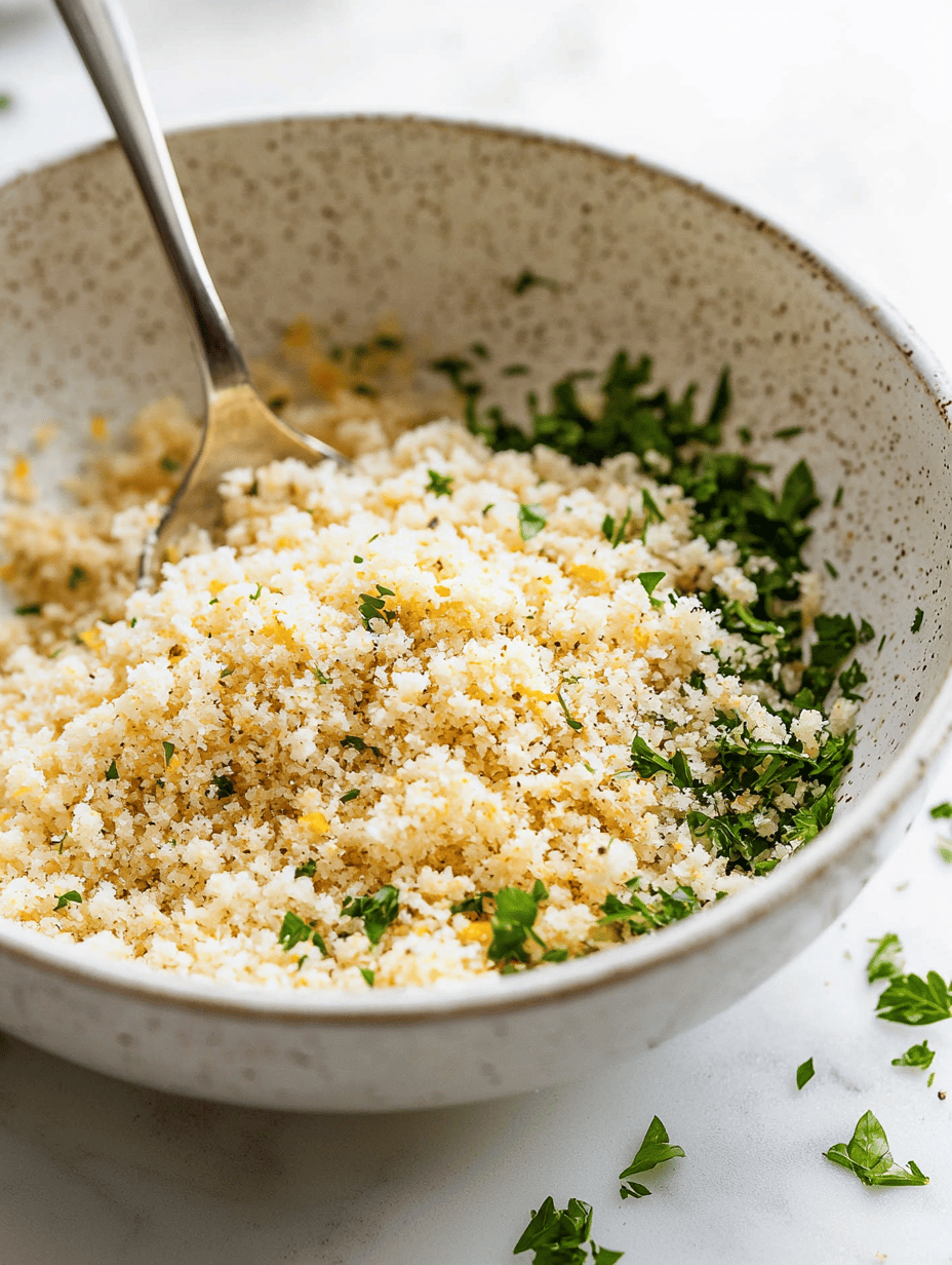 In a mixing bowl, combine panko breadcrumbs, lemon zest, chopped herbs, a drizzle of olive oil, and a pinch of salt and pepper. Toss until the mixture feels evenly coated and crumbly.