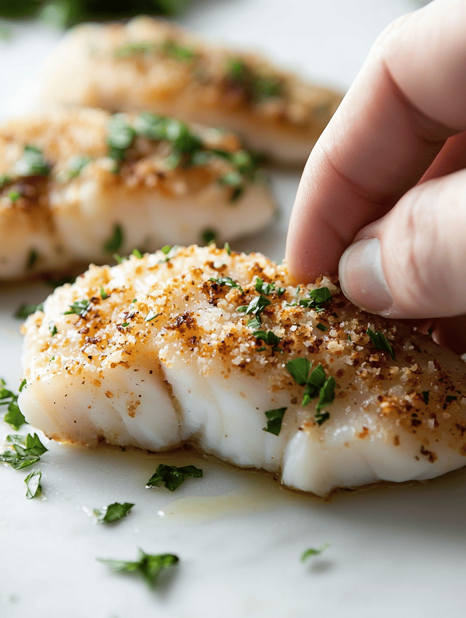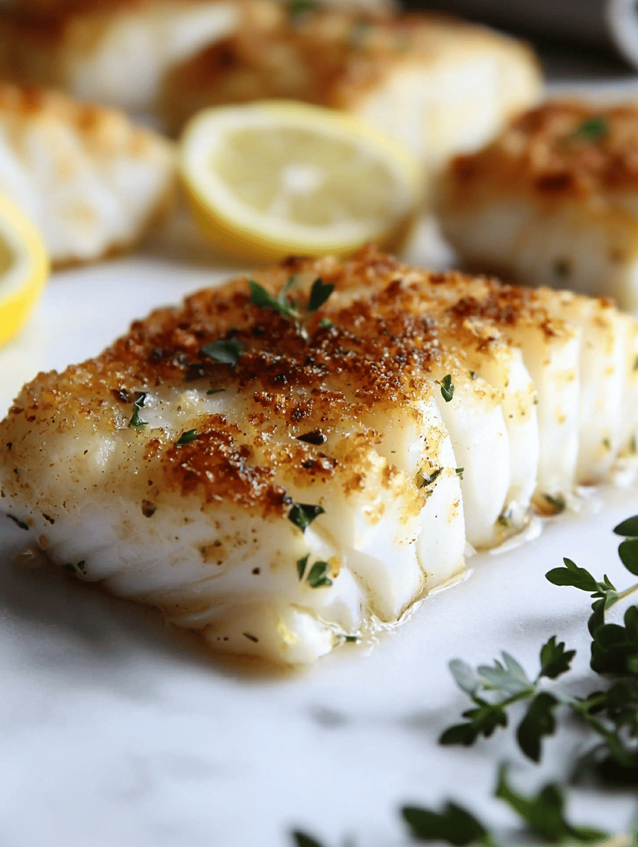 This baked cod dish features tender, flaky fish coated with a crisp, golden breadcrumb crust. It is seasoned with lemon zest and fresh herbs, offering a bright aroma and a light, flaky texture upon cooking. The result is an elegant, seaside-inspired main course that is simple to prepare.