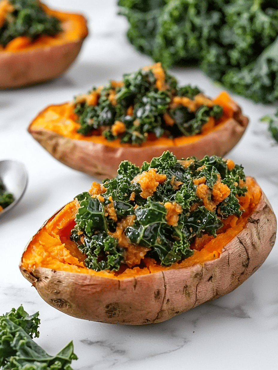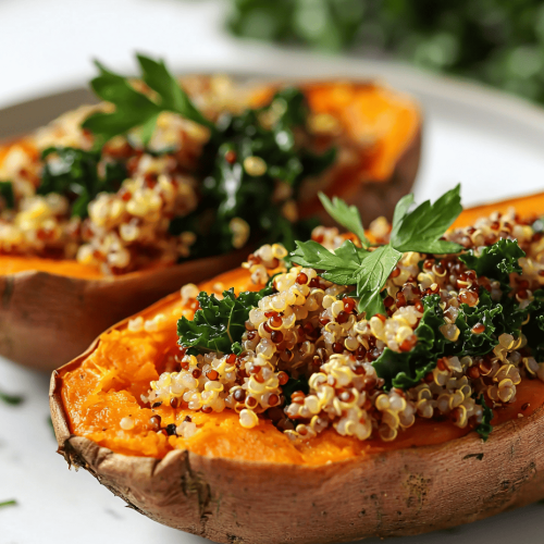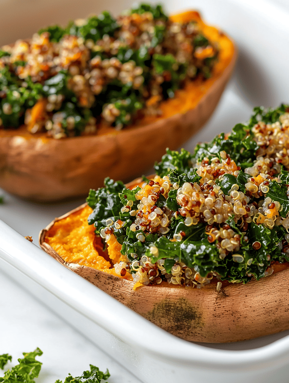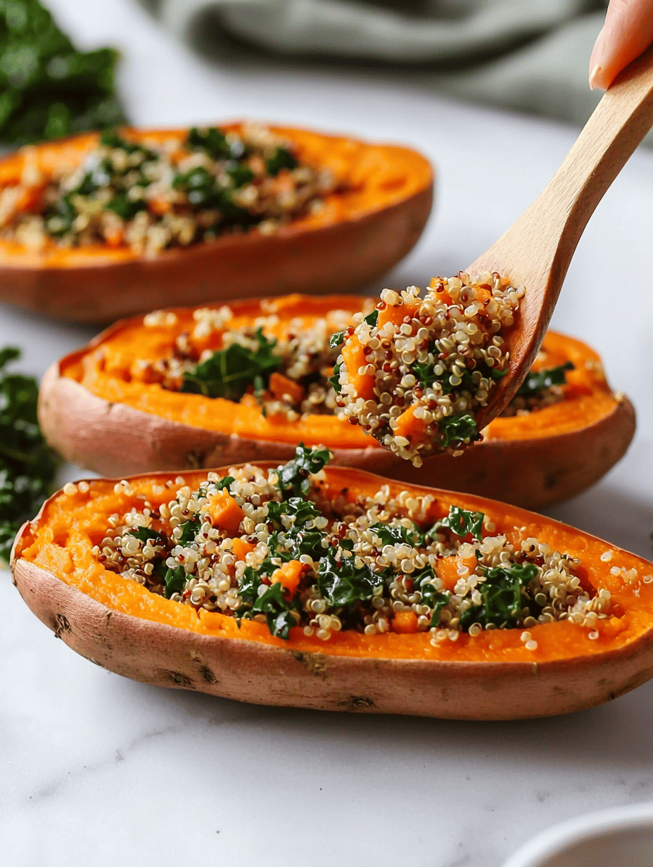Spoon the quinoa and kale mixture into the hollowed-out sweet potato halves, packing gently to fill the cavity evenly.