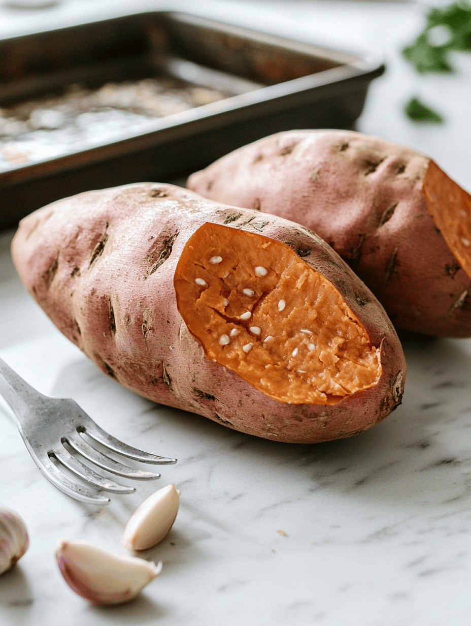 Preheat your oven to 400°F (200°C). Pierce each sweet potato a few times with a fork, then place them on a baking sheet. Bake for about 45 minutes until they are soft and the skin is slightly crispy.