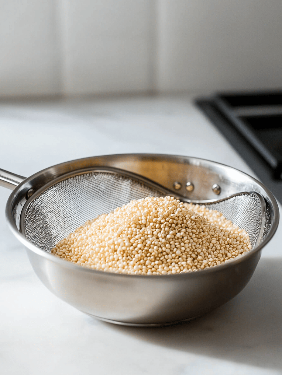 While the sweet potatoes bake, rinse the quinoa under cold water using a fine sieve, then combine it with water in a saucepan. Bring to a boil over medium-high heat, then reduce heat to low, cover, and simmer for 15 minutes until the liquid is absorbed and the quinoa is fluffy.
