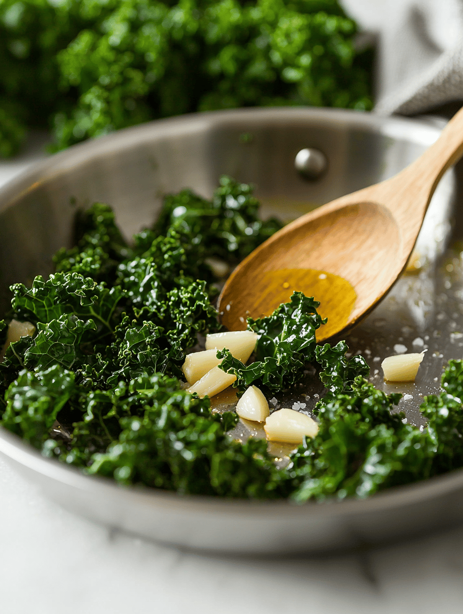 Meanwhile, heat one tablespoon of olive oil in a skillet over medium heat. Add the minced garlic and sauté for about 30 seconds until fragrant. Add the chopped kale, season with salt and pepper, and cook until wilted and tender, about 5 minutes. Set aside.