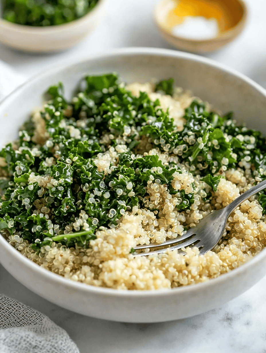 Fluff the cooked quinoa with a fork to loosen the grains. Mix half of the sautéed kale into the quinoa, along with a drizzle of olive oil and season with salt and pepper to taste.