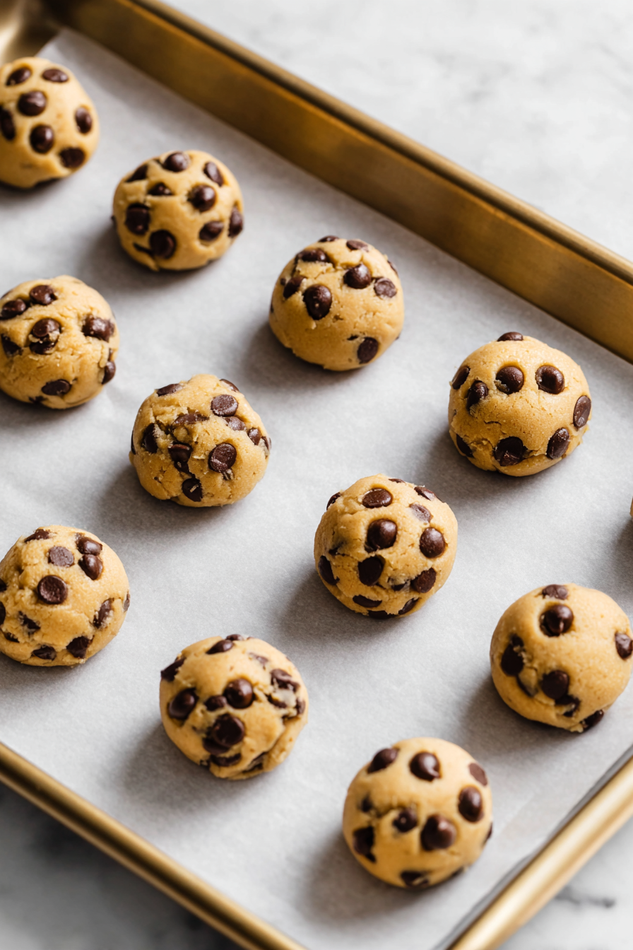 Using a 1 & 1/2-oz. scoop (3 tbsp), portion out 16 balls of dough and place them on 2 parchment-lined baking sheets.