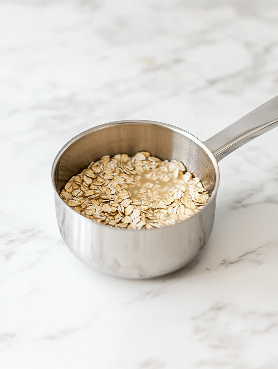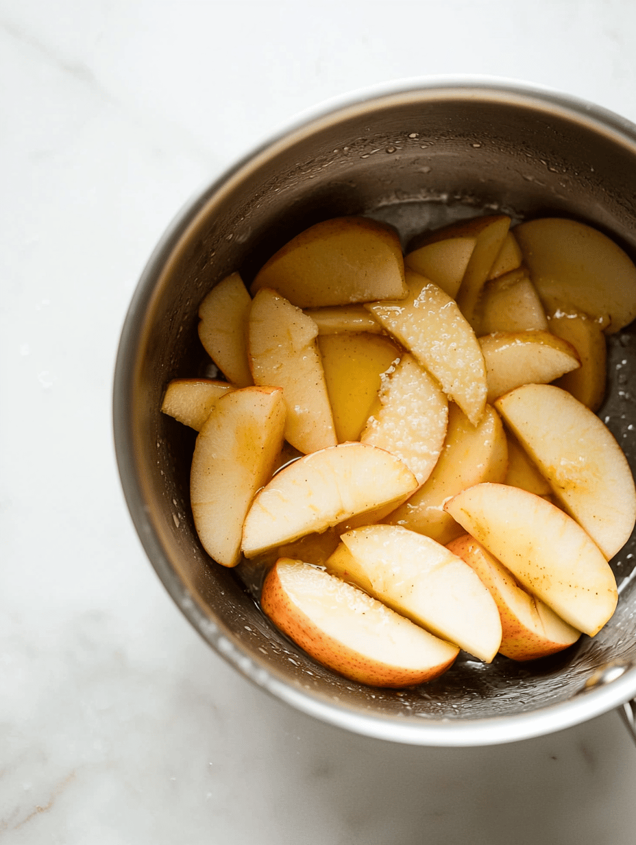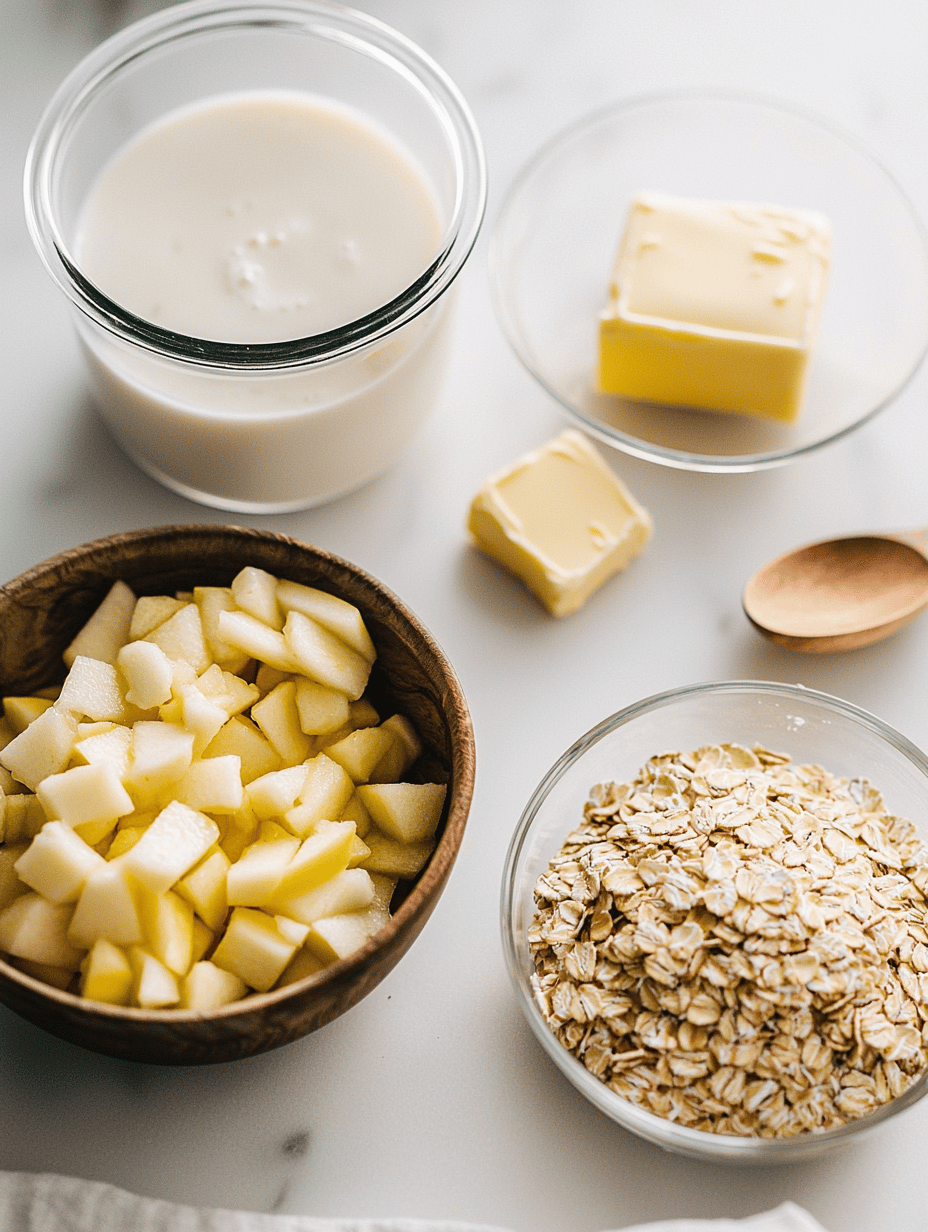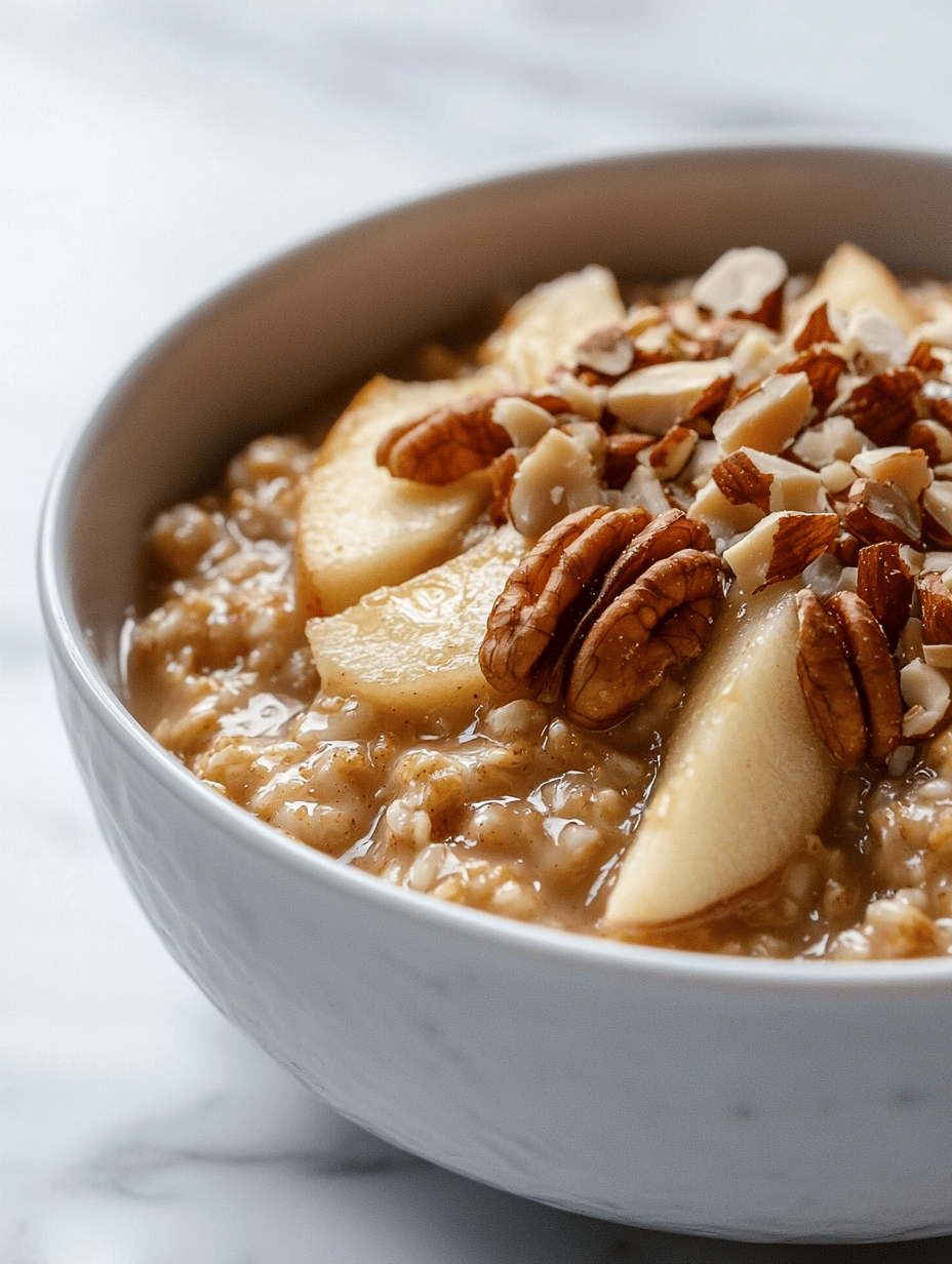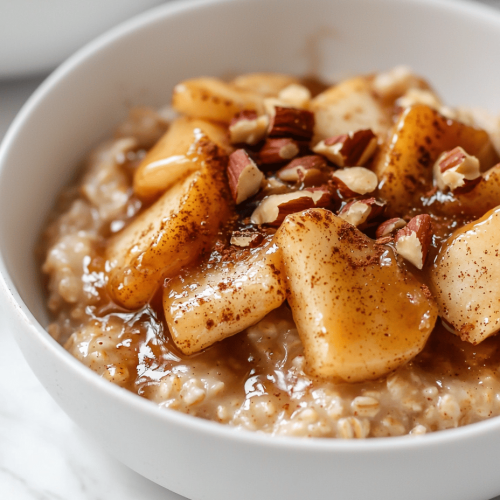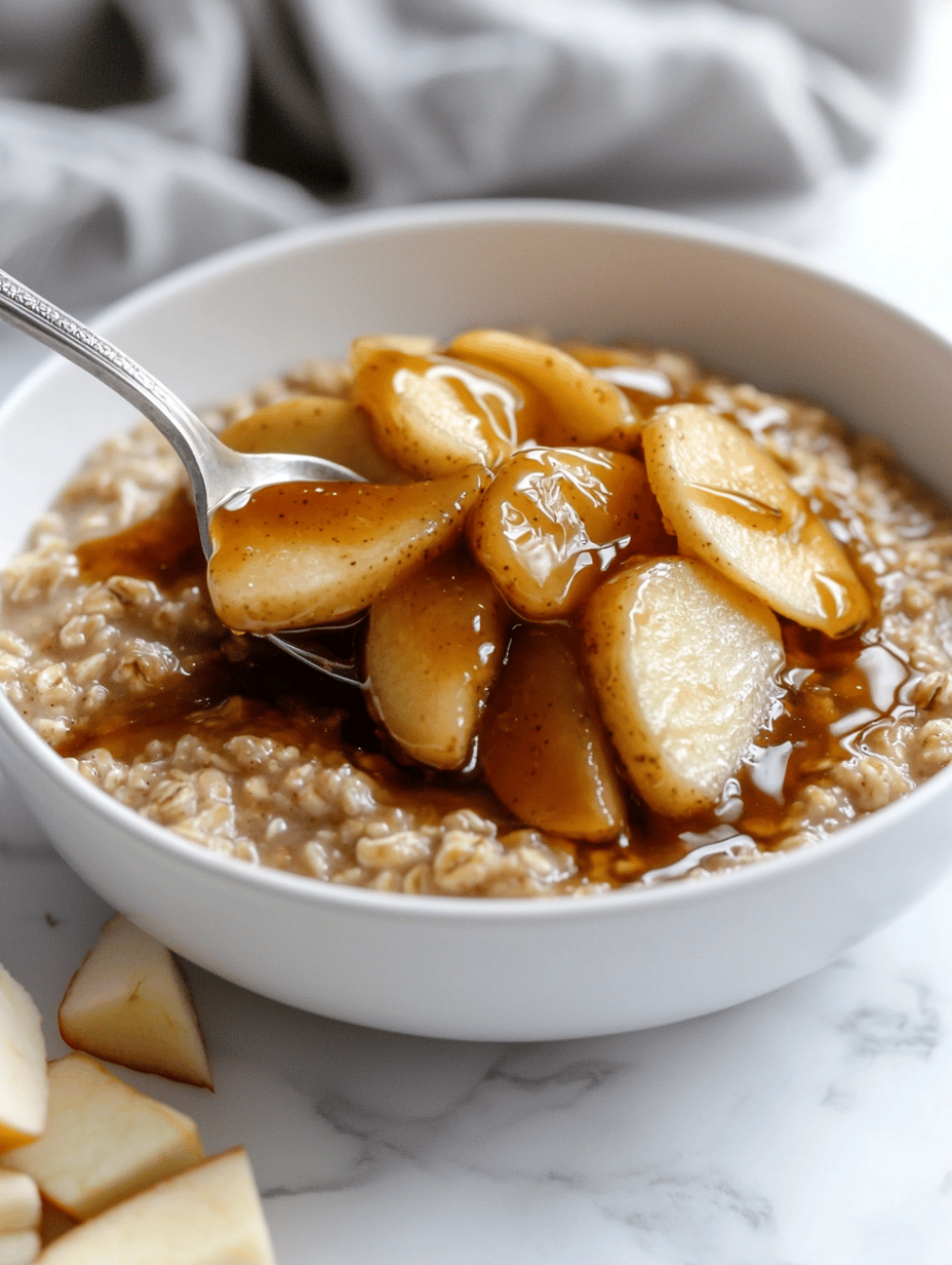 This breakfast combines creamy oatmeal with tender, caramelized apples infused with cinnamon and spices. The dish features a warm, comforting mixture of soft oats and sweet, golden-brown fruit topped with a crispy crunch, resulting in a textured and visually appealing bowl.