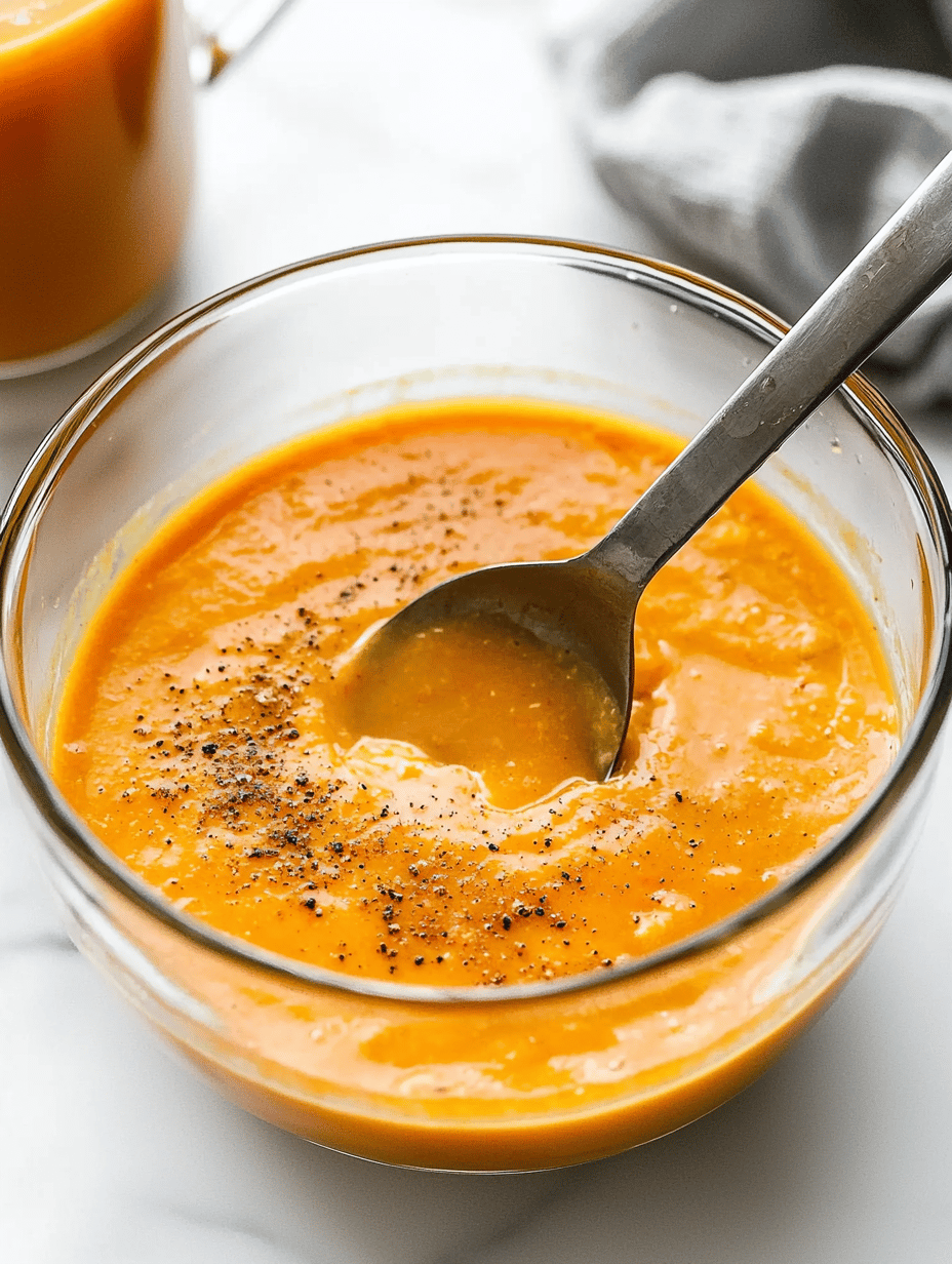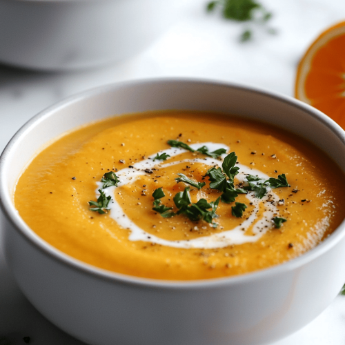 Scoop the warm, vibrant orange soup into bowls, and enjoy it immediately while comforting and flavorful.
