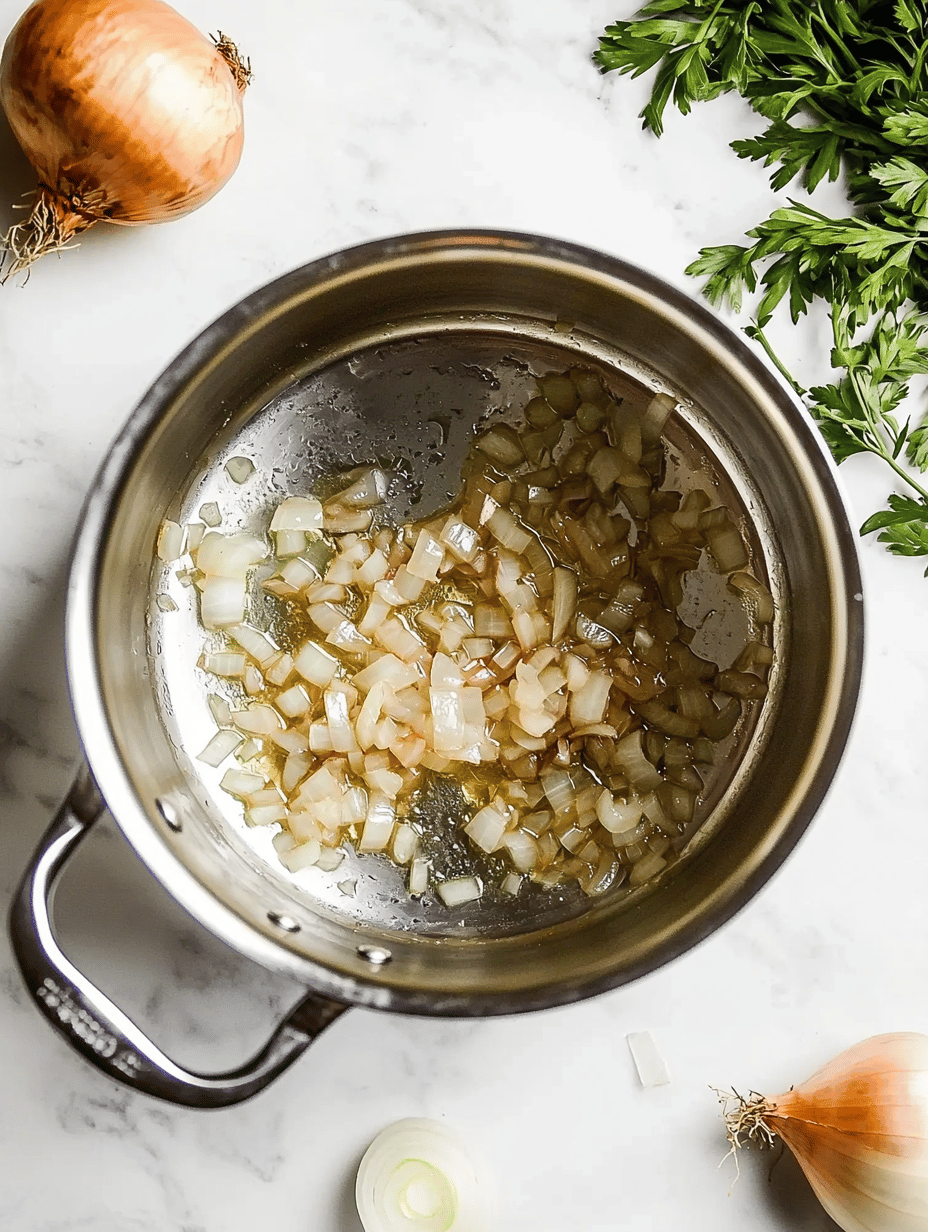 Begin by heating a large pot over medium heat and adding the olive oil. Once shimmering, toss in the chopped onion and sauté until it becomes translucent and fragrant, about 5 minutes.