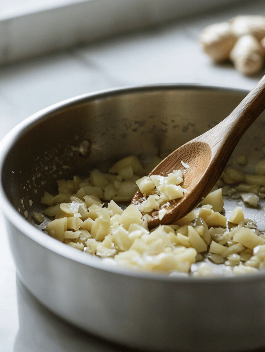 Add the minced garlic and sliced ginger to the pot, stirring constantly until fragrant, about 1 minute. The mixture should release a warm, spicy aroma as it cooks.