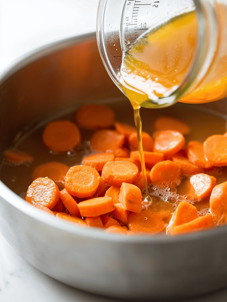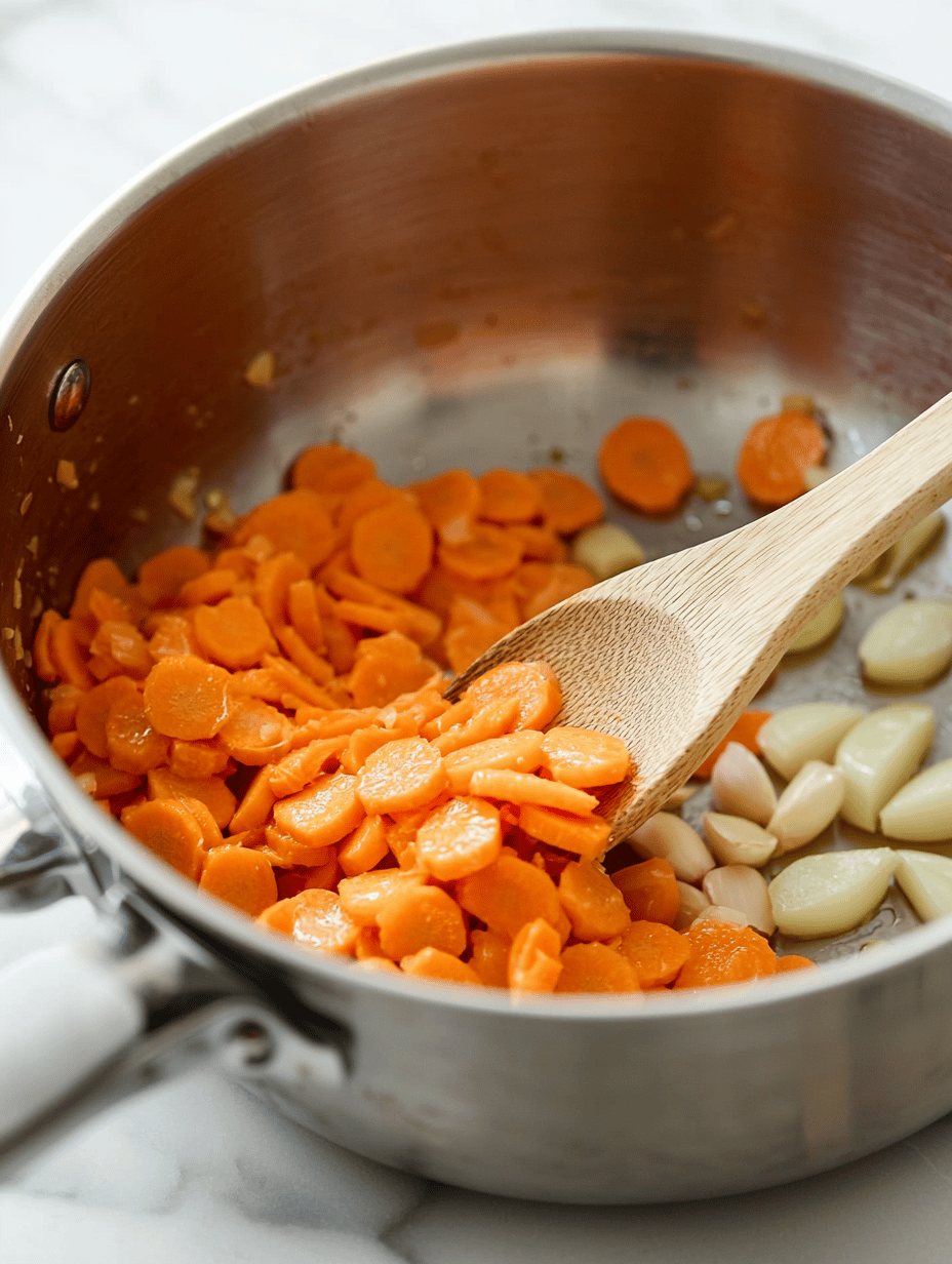 Pour in the vegetable broth, bringing the mixture to a boil. Once bubbling, reduce the heat to low, cover the pot, and let it simmer for about 20 minutes until the carrots are tender and easily pierced with a fork.