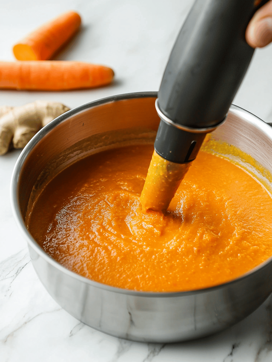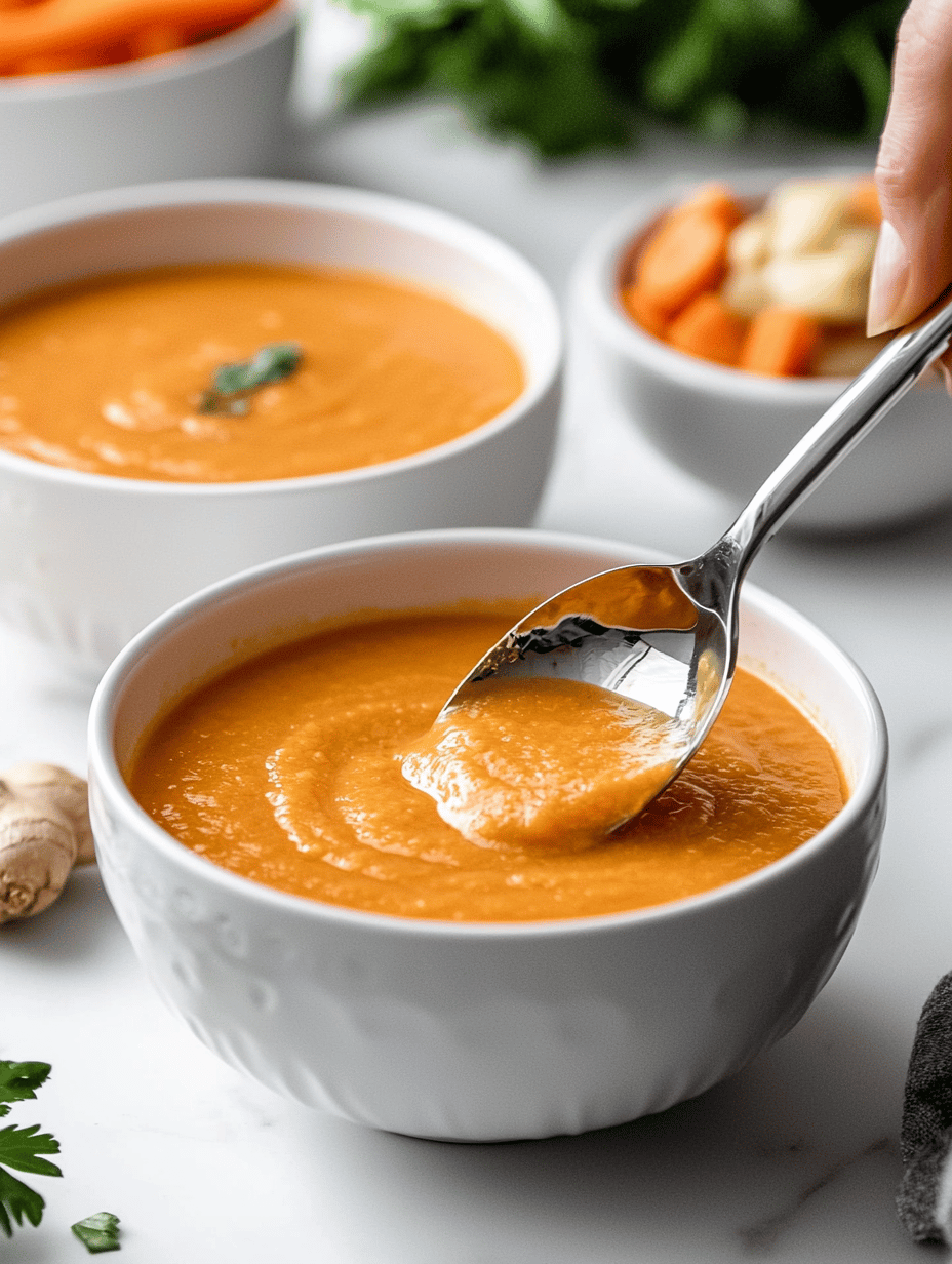 This carrot ginger soup is a smooth, velvety blend of cooked carrots and fresh ginger, pureed into a vibrant orange soup with a warming spice kick. The cooking process involves sautéing aromatics, boiling the carrots until tender, and then blending to a silky texture, resulting in a bright, flavorful dish with a comforting yet lively appearance.