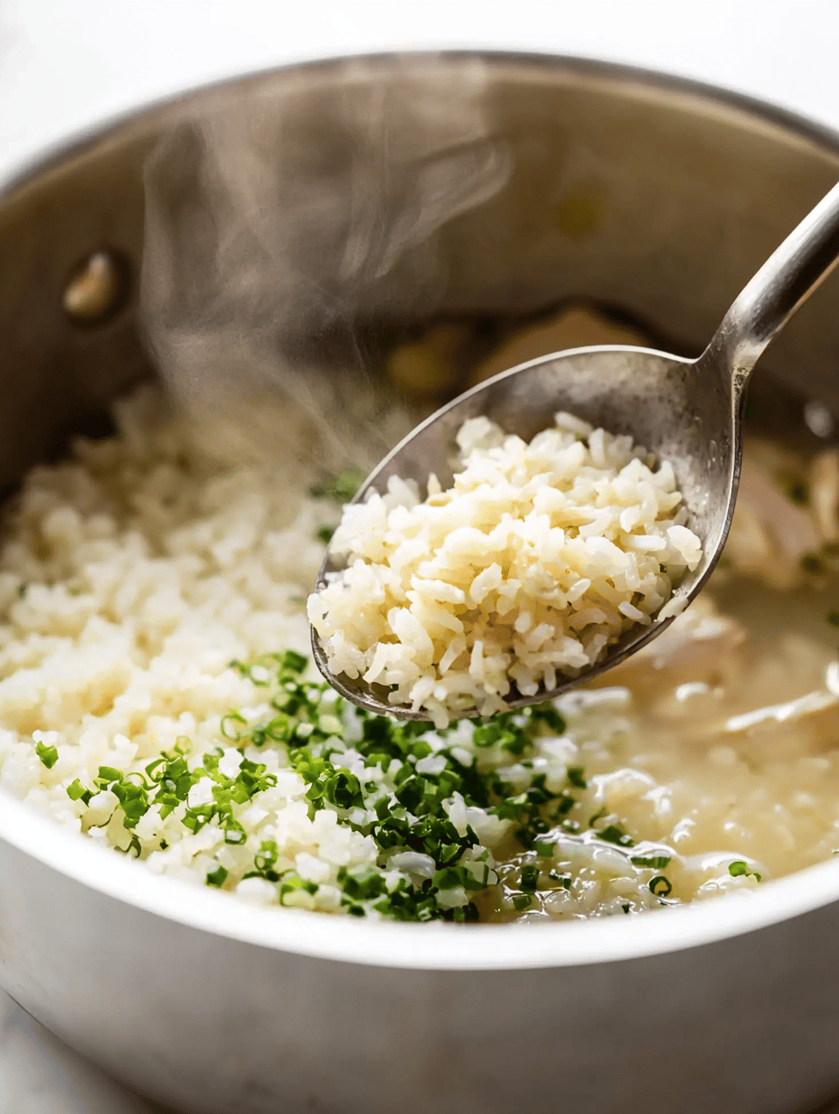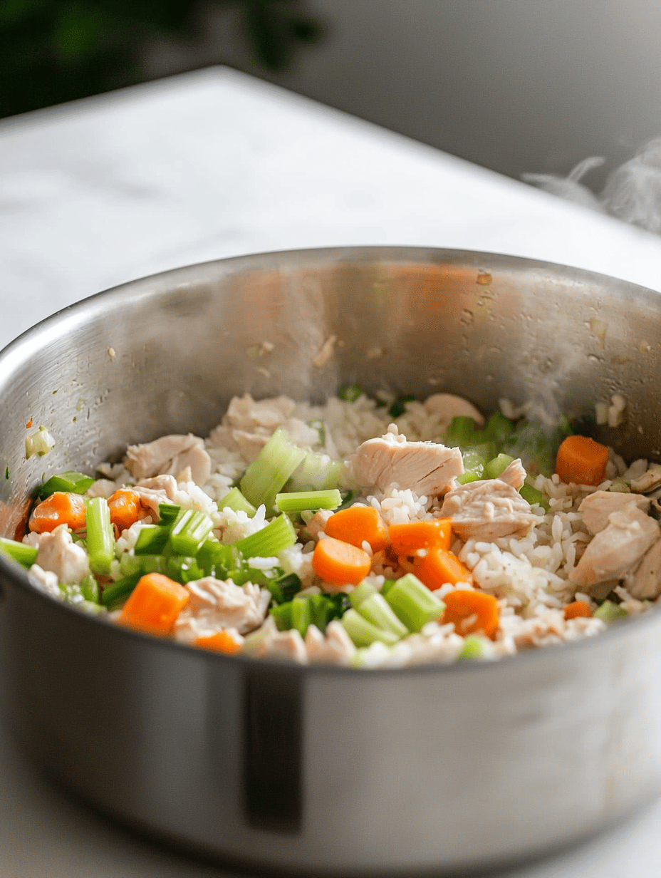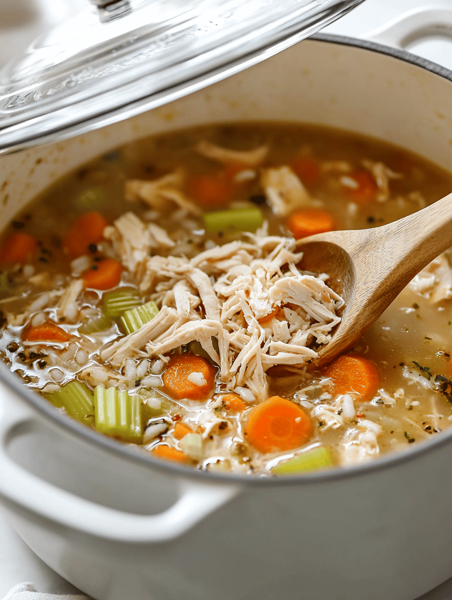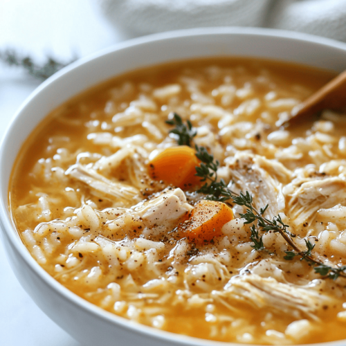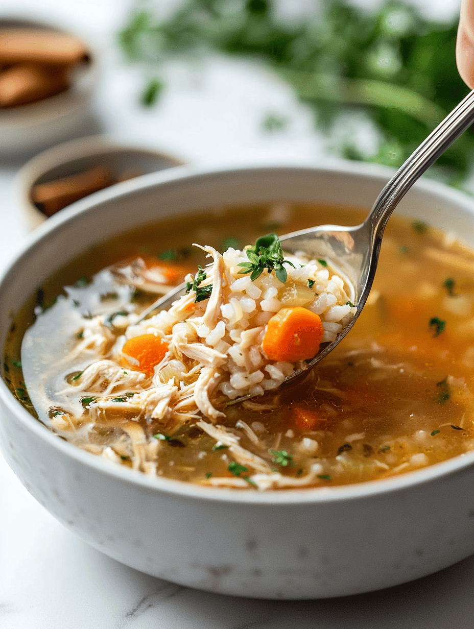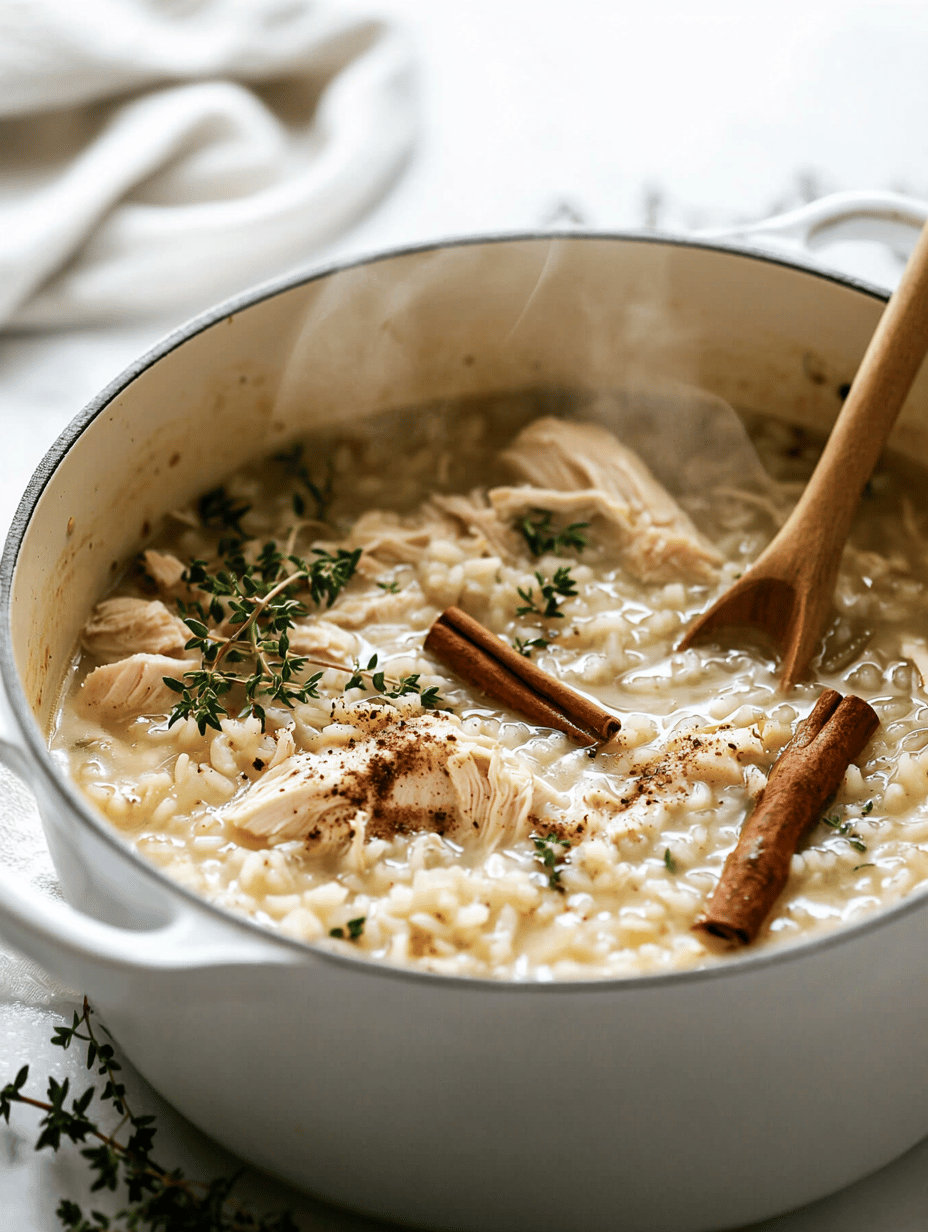 This hearty soup combines tender shredded chicken and fluffy rice simmered in a lightly spicy broth infused with cinnamon and thyme. It features a comforting, slightly thickened texture with colorful vegetables and aromatic herbs, resulting in a warm and filling dish perfect for chilly evenings.