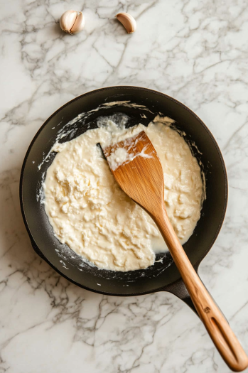 Melt butter in the same skillet over medium heat. Add garlic and sauté for 1 minute. Stir in the flour and cook for another minute.