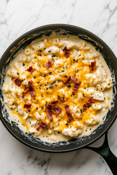 Add the cooked pasta to the skillet and toss to coat in the sauce. Stir in the cooked chicken and let it heat through. Garnish with bacon or mix it into the sauce for extra flavor. Serve warm!