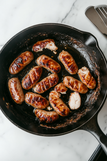 Sauté Sausages: In a large cast iron skillet or heavy-bottomed skillet, heat the olive oil over medium-high heat. Add the sliced sausages and sauté for 8-10 minutes until browned and fully cooked. Remove the sausages from the skillet and set aside.