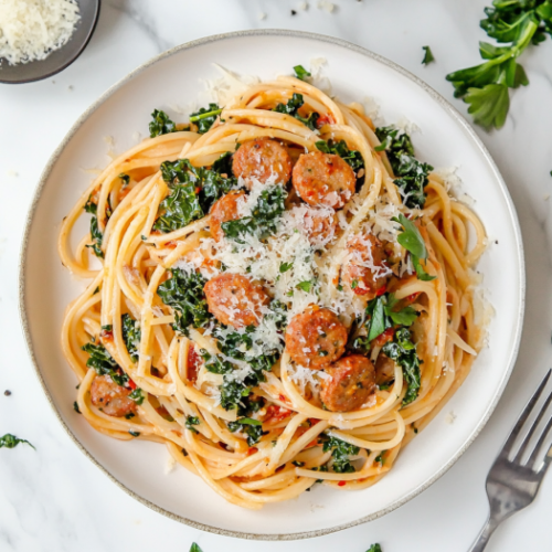 This Chicken Sausage Spaghetti is a quick and delicious weeknight dinner that comes together in just 35 minutes! With mild Italian chicken sausage, vibrant kale, rich marinara sauce, and a sprinkle of Parmesan cheese, it’s a satisfying meal that the whole family will love.