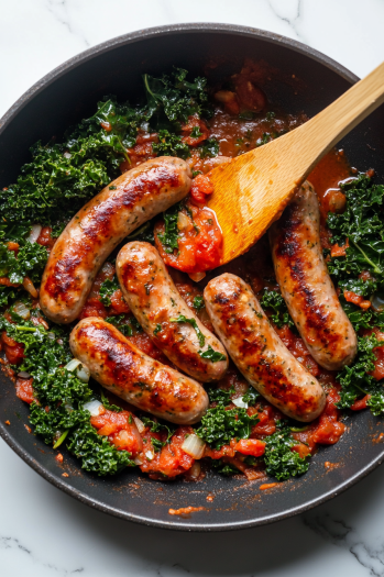 Combine Ingredients: Return the cooked sausages to the skillet. Stir in the marinara sauce, chopped kale (or spinach), salt, pepper, and remaining ½ cup of chicken broth. Mix until well combined.