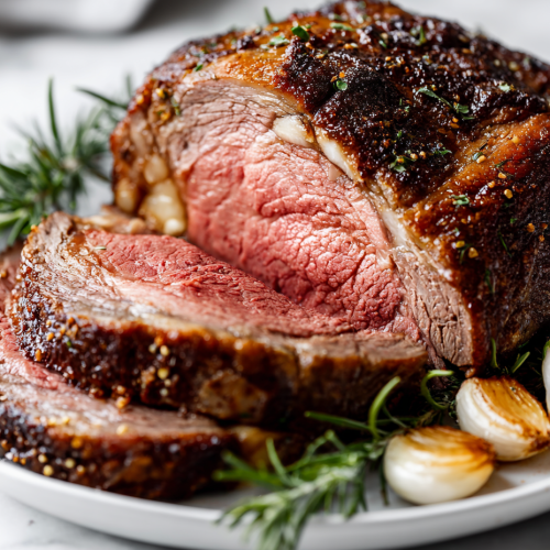 This prime rib recipe involves seasoning a marbled beef roast with salt, pepper, and garlic, then roasting it slowly to achieve a tender, juicy interior with a beautifully browned crust. The process emphasizes patience and careful temperature control, resulting in a stunning centerpiece with rich beef flavor and a succulent, eye-catching appearance.