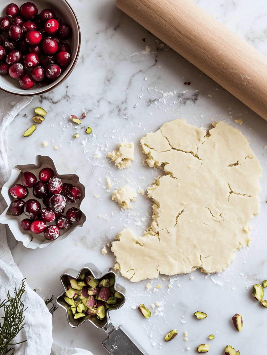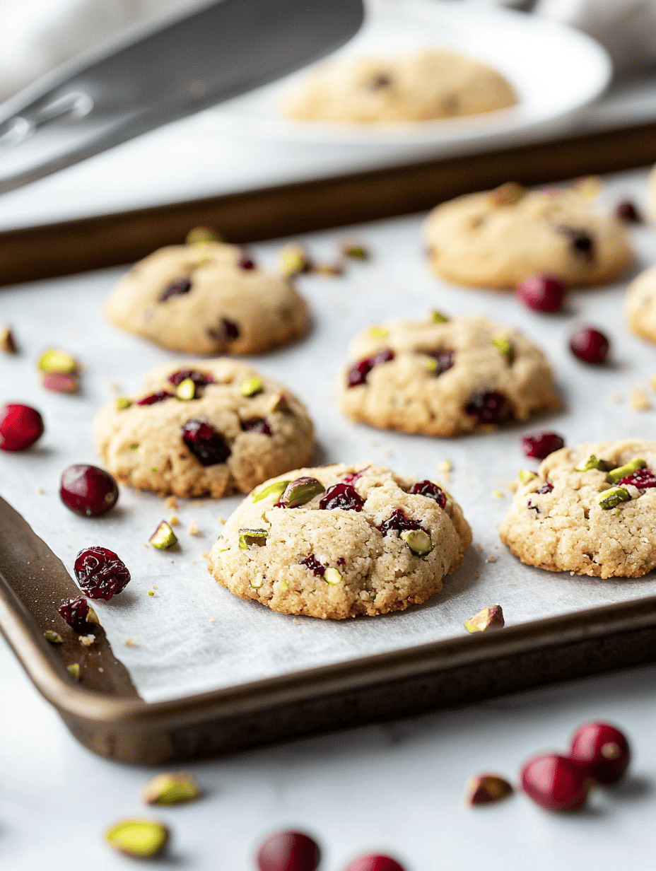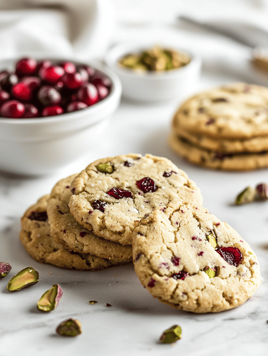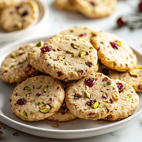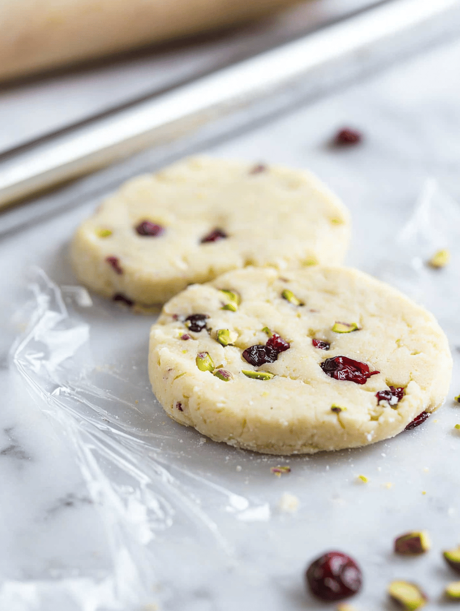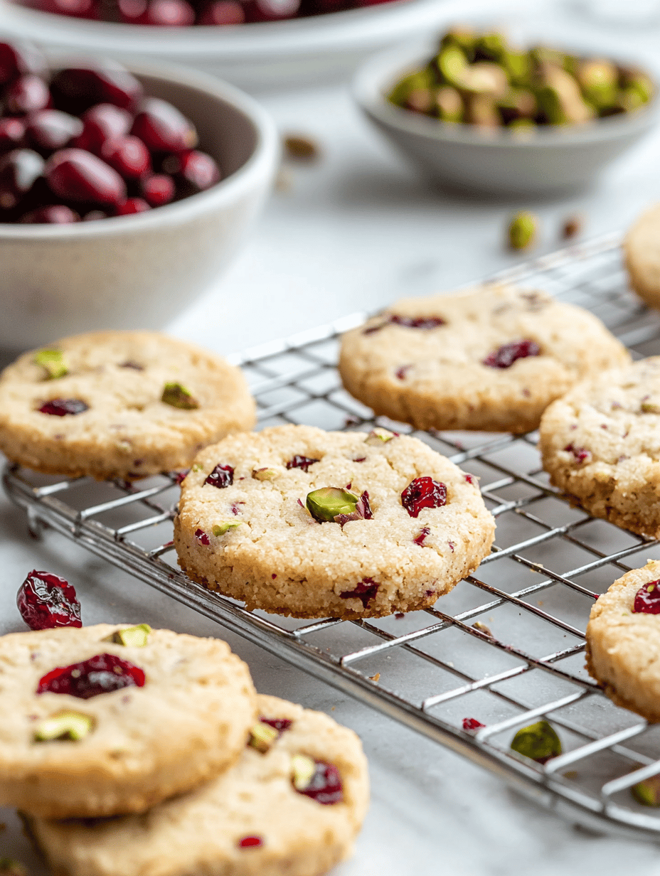 These shortbread cookies are made by mixing butter, sugar, and flour to create a tender dough, which is then combined with chopped cranberries and pistachios for added flavor and texture. The dough is shaped and baked until lightly golden, resulting in crisp, buttery cookies with colorful bursts of fruit and nuts throughout.