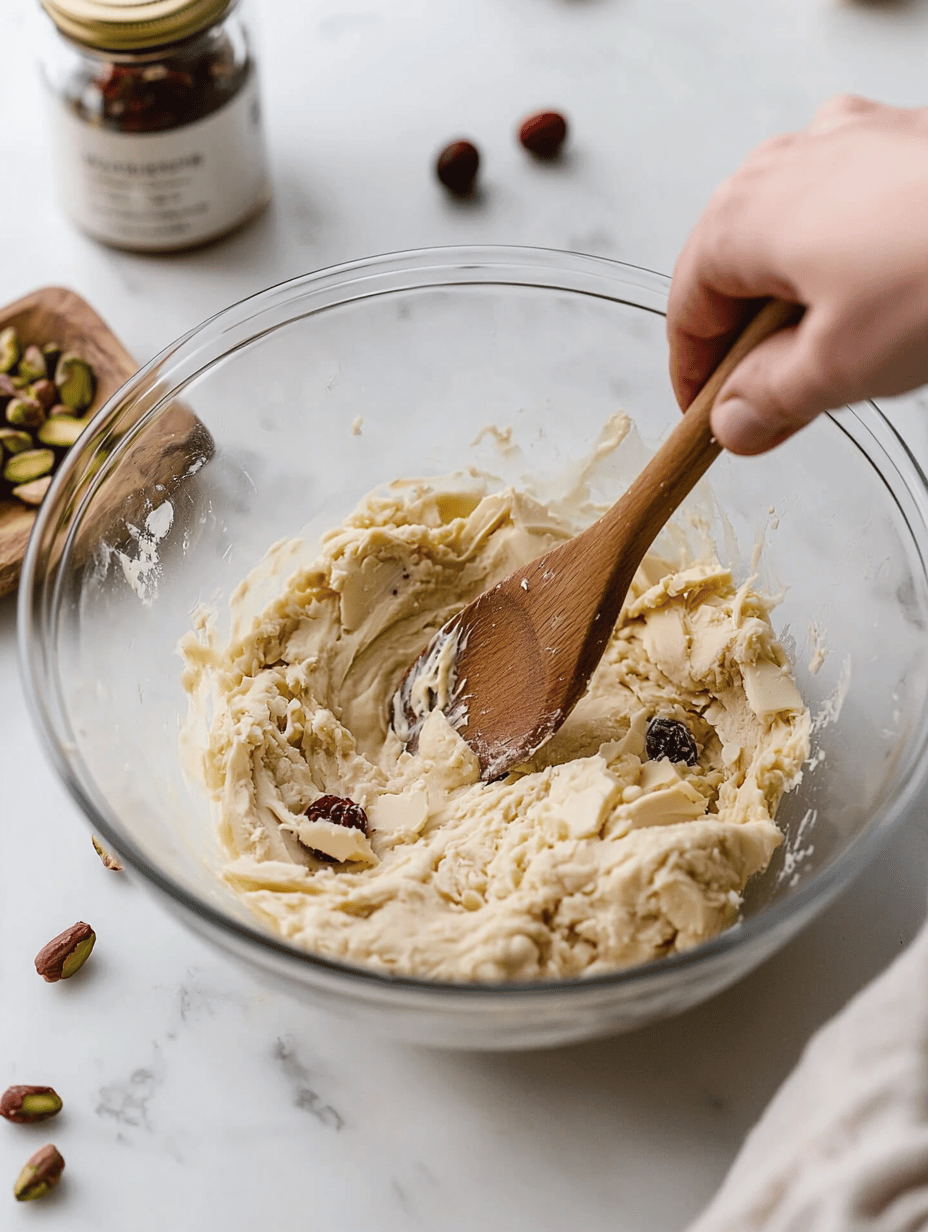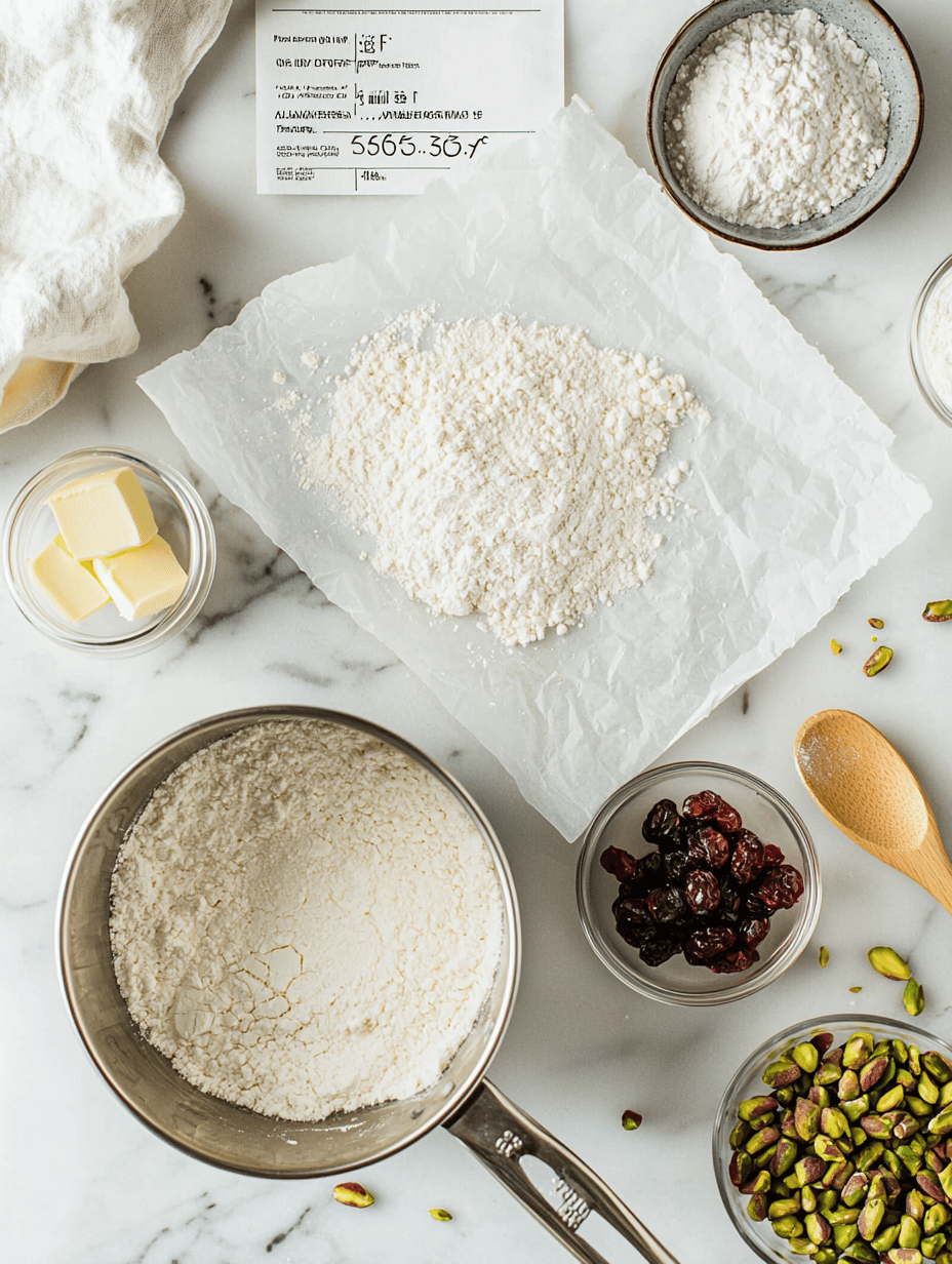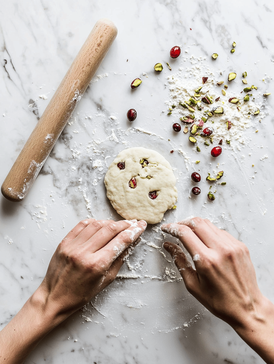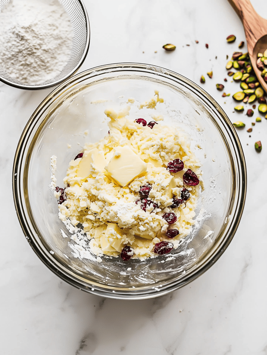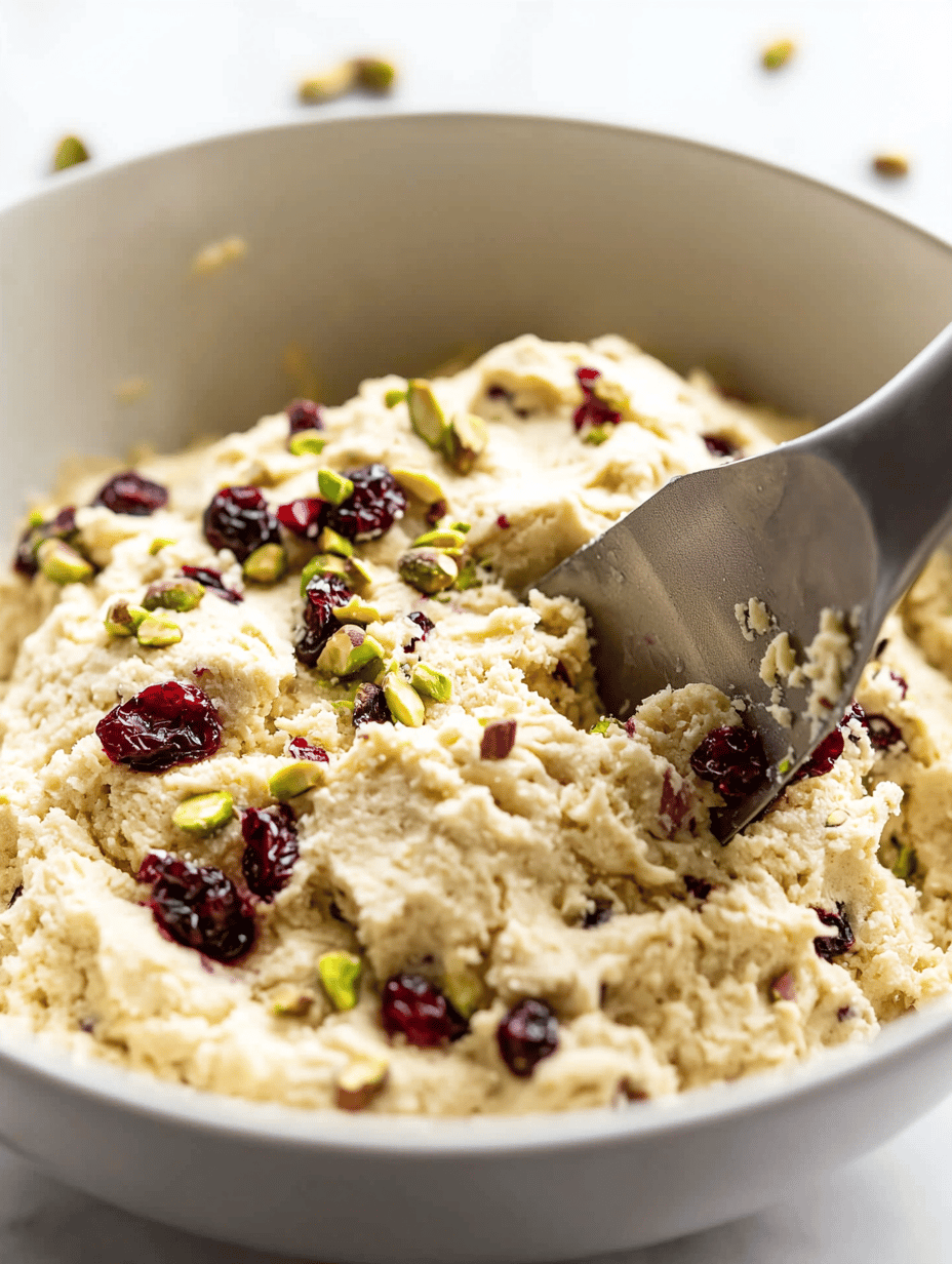 These shortbread cookies are made by mixing butter, sugar, and flour to create a tender dough, which is then combined with chopped cranberries and pistachios for added flavor and texture. The dough is shaped and baked until lightly golden, resulting in crisp, buttery cookies with colorful bursts of fruit and nuts throughout.