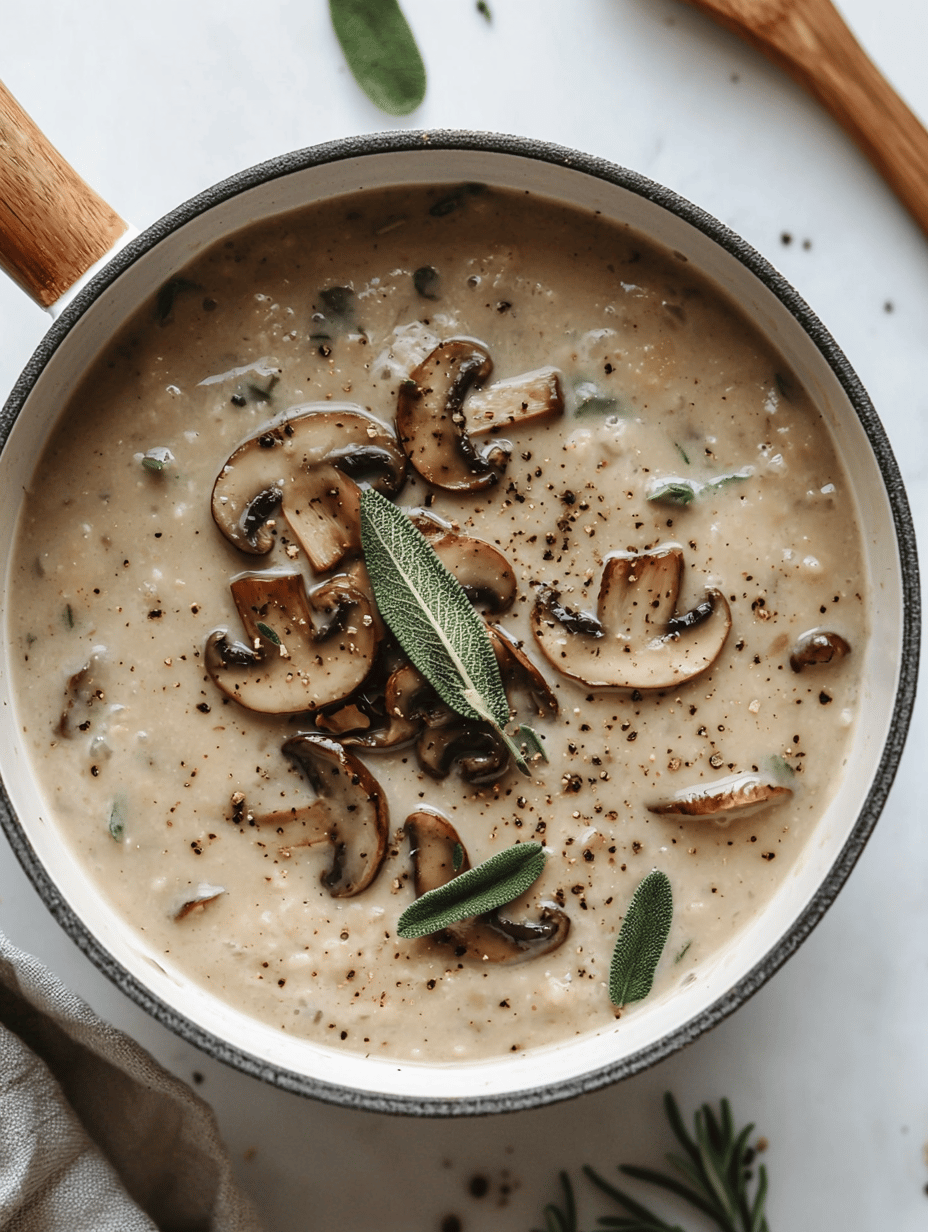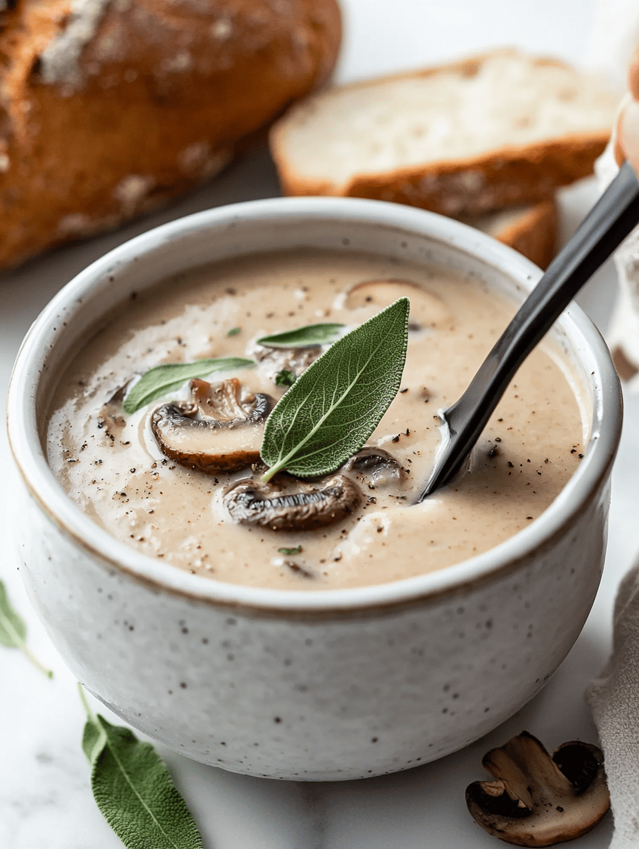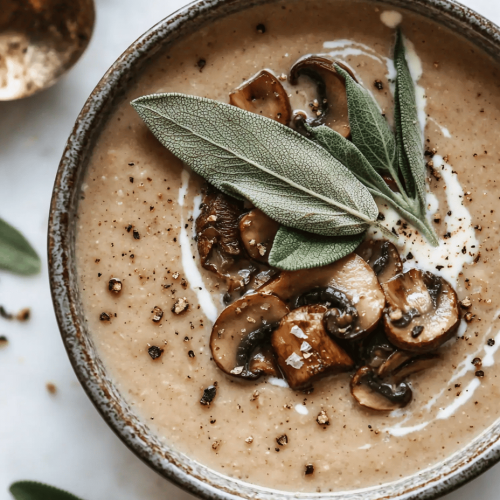This mushroom soup is made by sautéing assorted mushrooms until tender and golden, then simmering with aromatic spices and cream to create a velvety texture. Finished with sage and a touch of nutmeg, it has a rich, earthy flavor profile and a smooth, spoonable consistency.