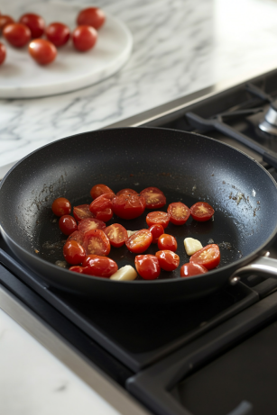 Add the cherry tomatoes, season with salt and pepper, and cook until the tomatoes begin to burst.