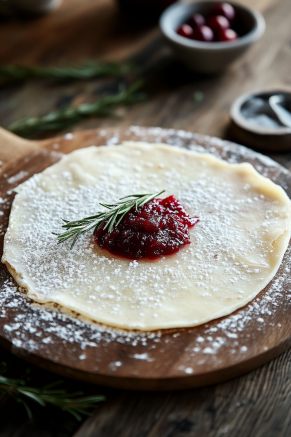 Lay softened rice paper on a cutting board. Add 1 teaspoon cranberry sauce, a Brie slice, and a sprinkle of chopped rosemary in the center.