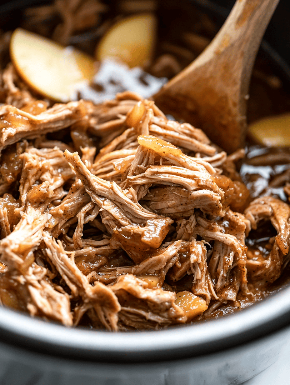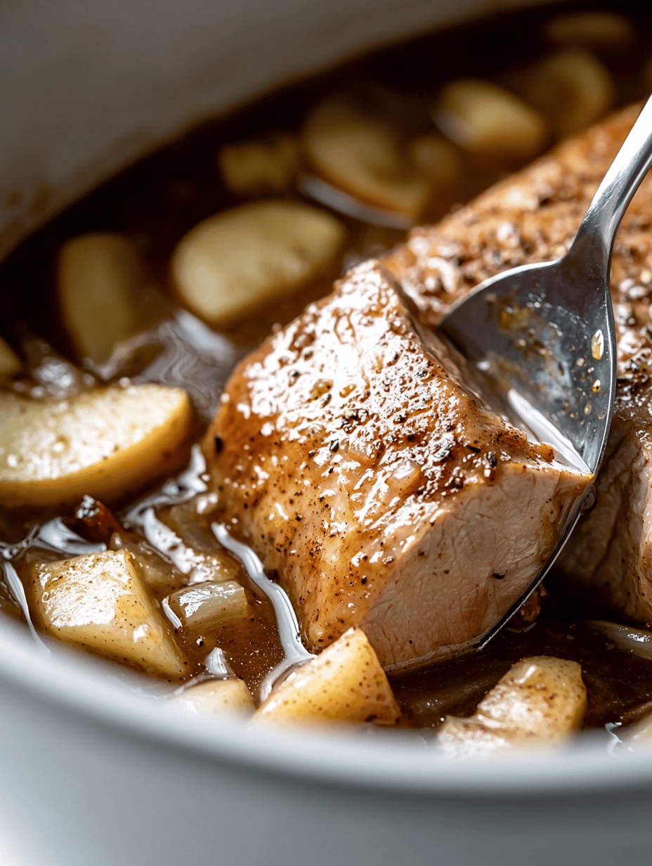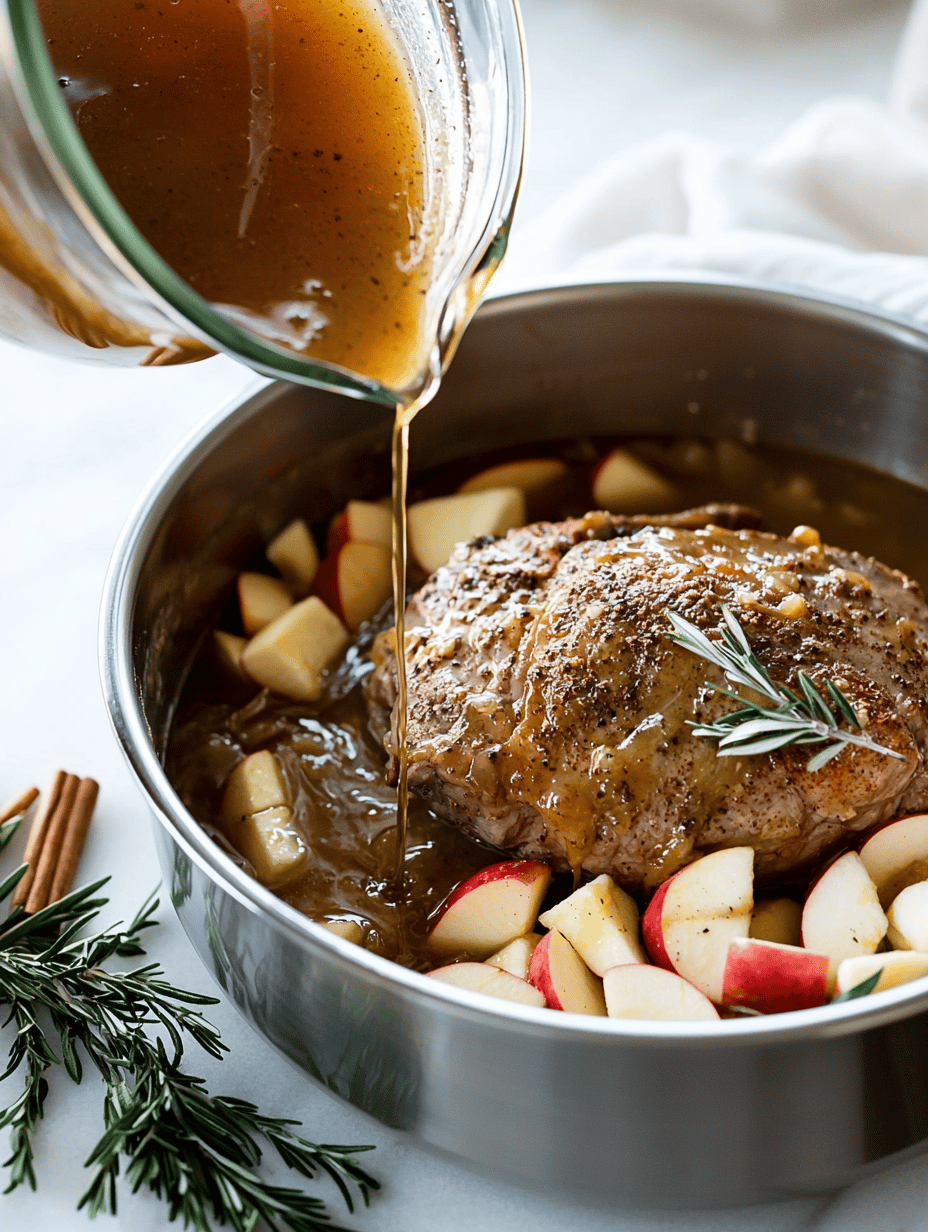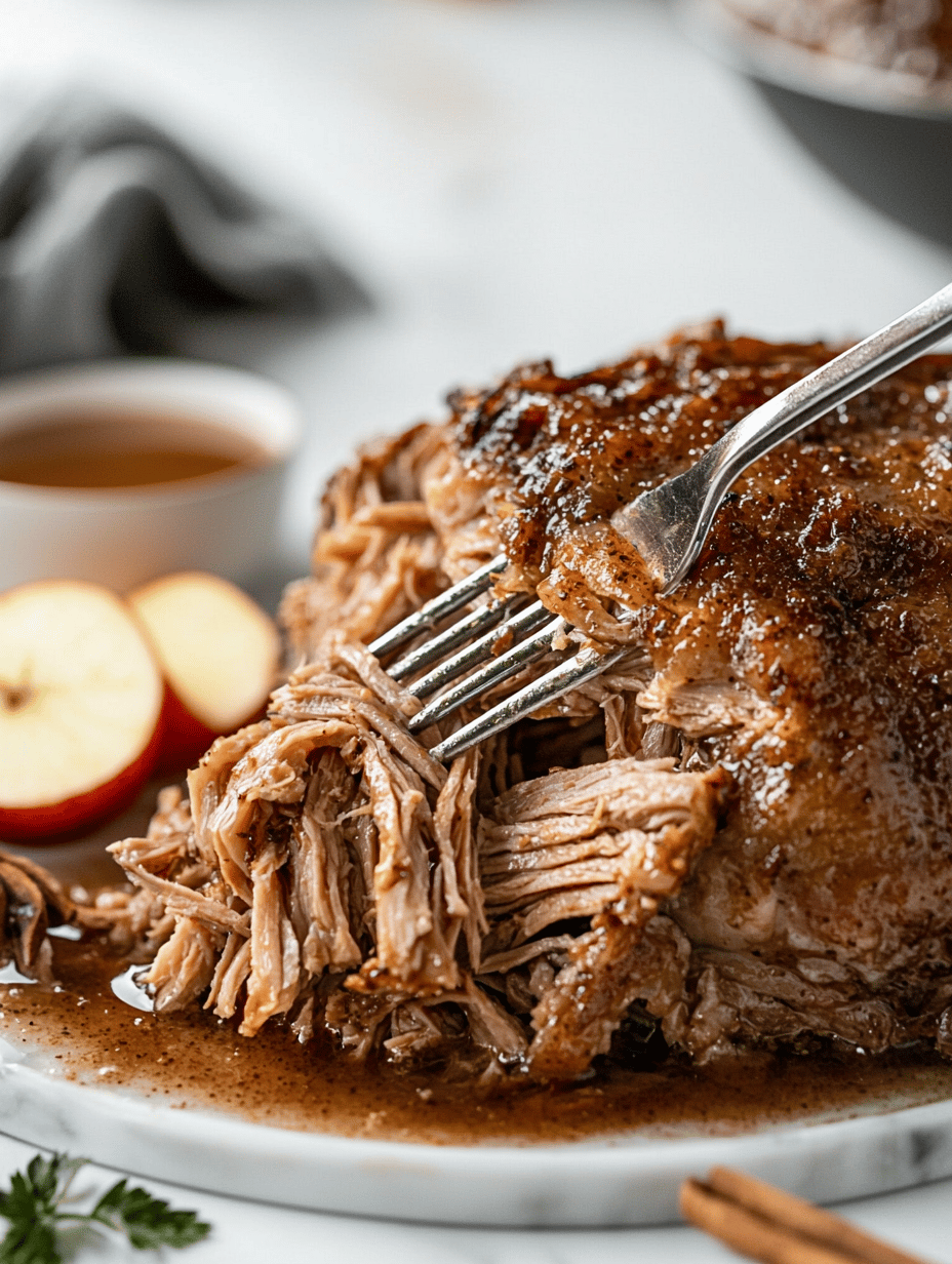 This dish features a pork roast slow-cooked in spiced apple cider until tender and fall-apart delicious. Main ingredients include pork, apple cider, and seasonings, resulting in a moist, flavorful meat with a rich, saucy consistency and a fragrant autumn aroma.