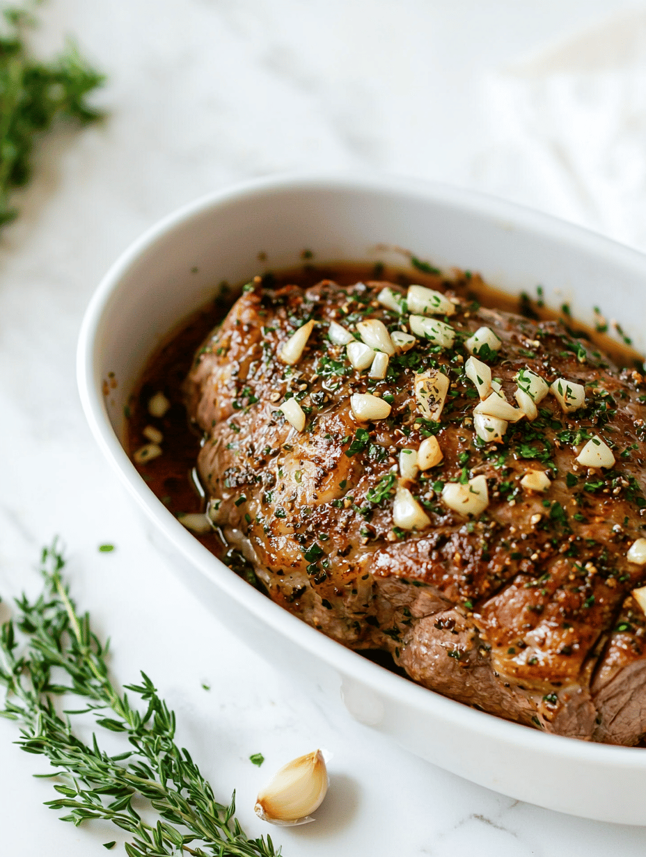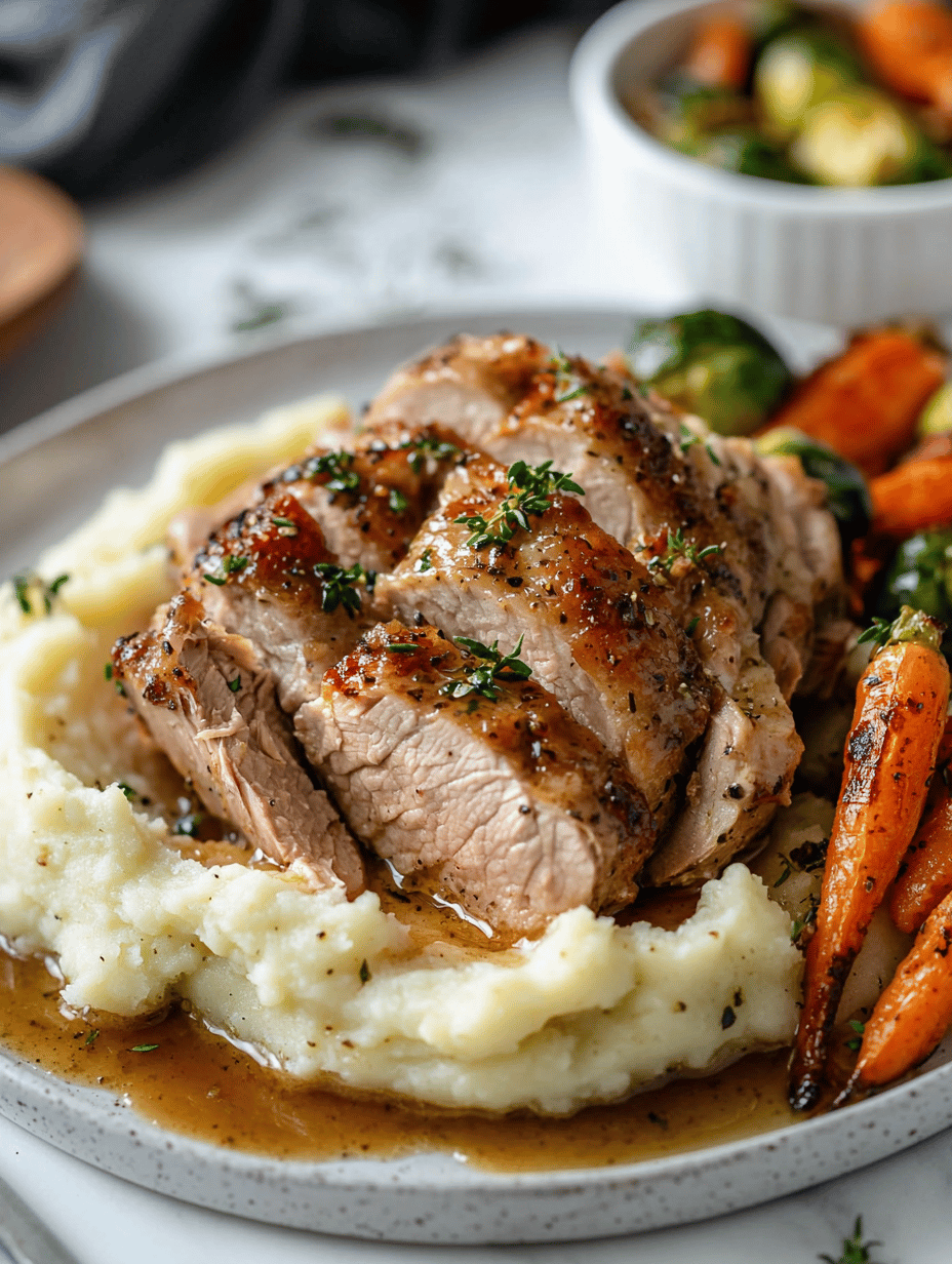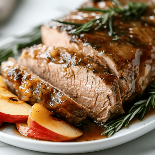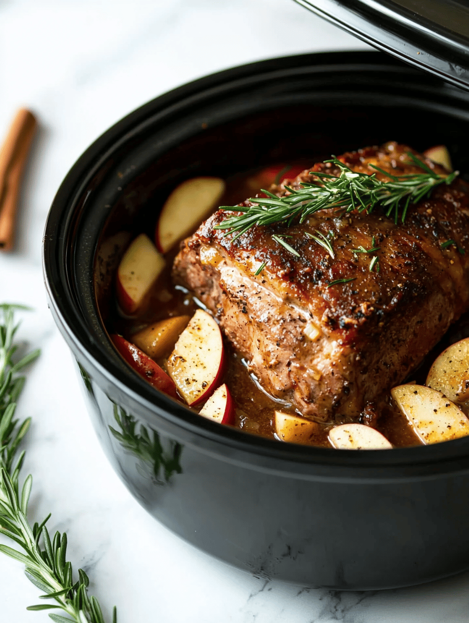 This dish features a pork roast slow-cooked in spiced apple cider until tender and fall-apart delicious. Main ingredients include pork, apple cider, and seasonings, resulting in a moist, flavorful meat with a rich, saucy consistency and a fragrant autumn aroma.