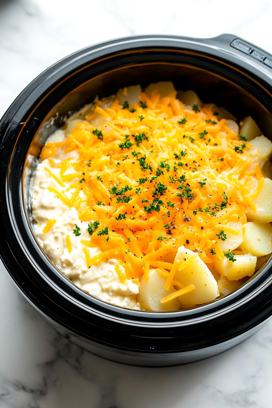After 4 hours, remove the lid and sprinkle the remaining 1 cup of shredded cheese over the potatoes.