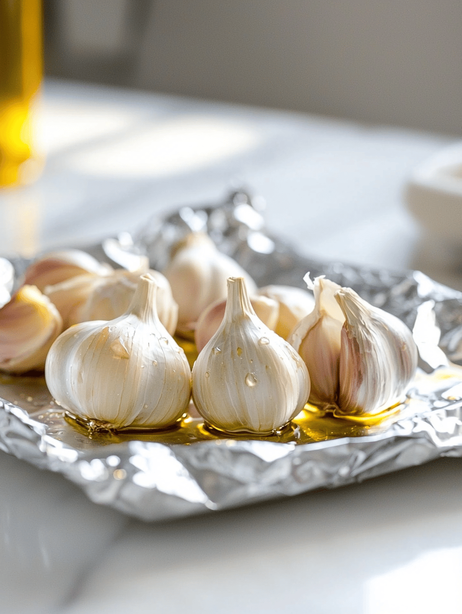 Place whole garlic cloves on a piece of foil, drizzle with olive oil, and fold to seal. Roast in a preheated oven at 400°F (200°C) for about 20 minutes until fragrant and soft.