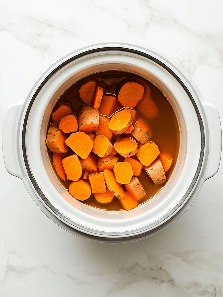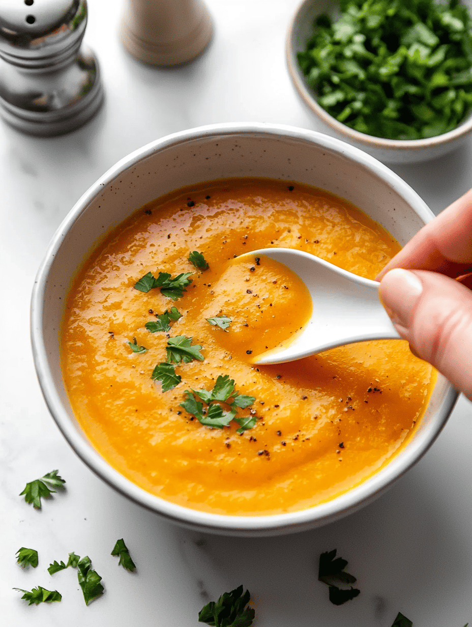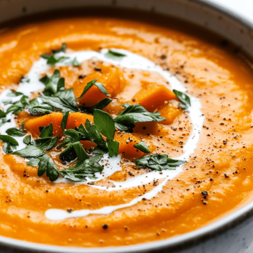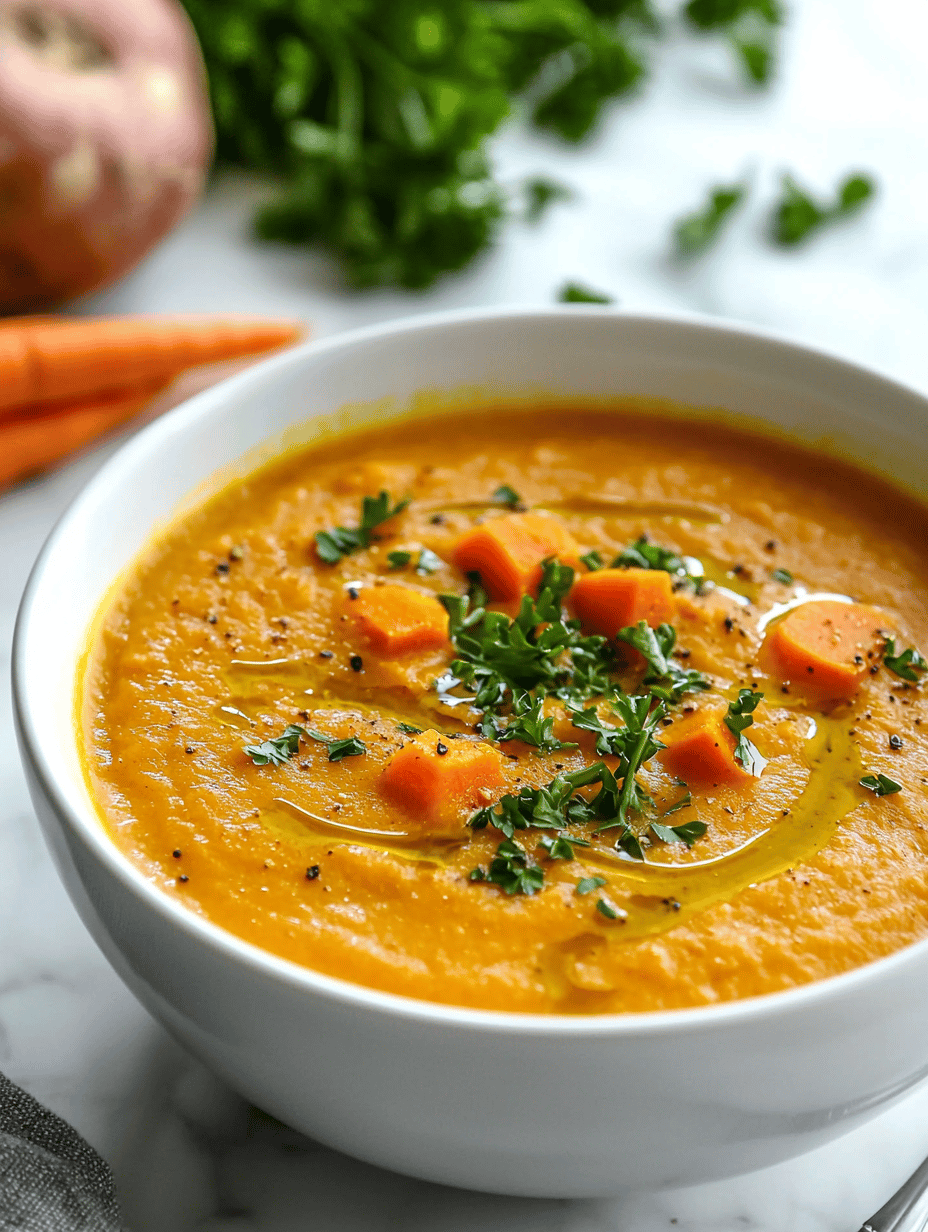 This soup is made by slow-cooking sweet potatoes and carrots until soft and fragrant, creating a velvety, comforting puree. The dish features a smooth, bright orange appearance with a naturally sweet flavor and a subtle, hearty texture.
