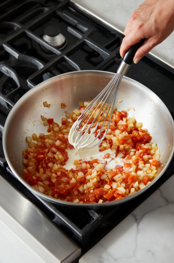 Add Tomatoes And Cream: Pour in the crushed tomatoes and stir. Let the sauce simmer for 10 minutes, then add the heavy cream. Stir until the sauce is smooth and creamy. Season with salt, pepper, and red pepper flakes (if using).